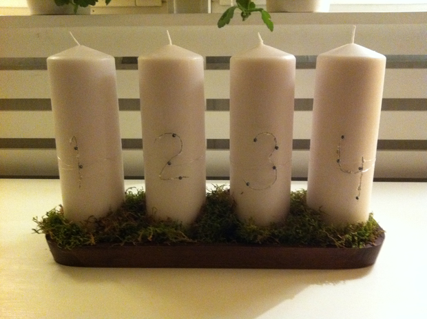 När jag fick siffrorna som jag ville ha dem fäste jag dem på blockljusen med den tunnare ståltråden. Lite dekoration med mossa och så vad adventsljusstaken färdig.