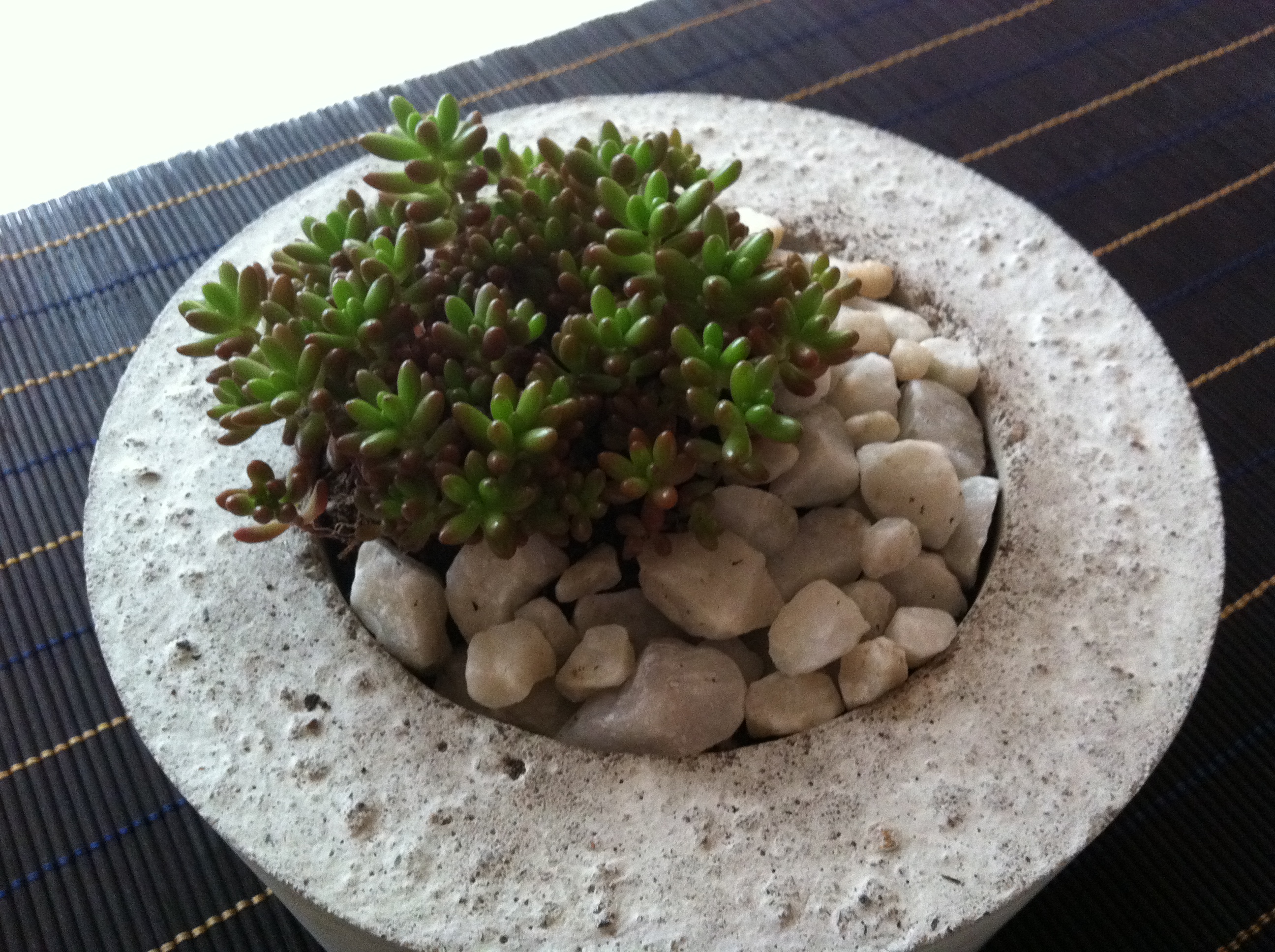 Jag har börjat tillverka saker i betong och har testat att göra en kruka. Den blev rätt liten och låg och jag har hela tiden tyckt att det skulle passa med någon slags suckulent i den. När jag planterade suckulenten blev den högre än krukan så jag fick ta bort en del av jorden så den bara kikade upp ovanför kanten. Jag planterade den medvetet mot ena kanten eftersom jag ville ha något mer bredvid suckulenten. Vid städningen av altanen hittade jag en glasburk med vita stenar. Jag tvättade rent dem och lade dem så de täckte jorden i krukan. Fortfarande saknas det något och jag börjar tro att min dotter Leia hade rätt när hon ville köpa två större pärlor att trycka ner i jorden. Jag låter det gå några dagar så kanske jag kommer på vad det är som saknas.