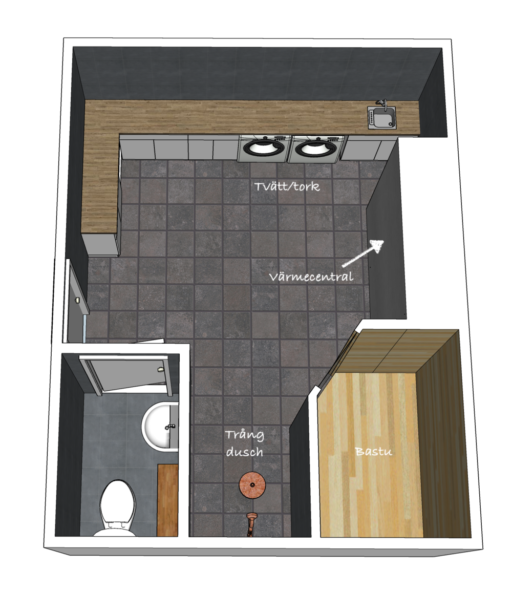 Sen slog det mig, som ni ser på bilden så har vi ju en bastu där nere som vi inte använder. Den är mest en avlastningsyta för tvätt. Tanken var ju att slita ut denna och bygga ett badkar/pool där, skissade även på idén att ställa ett vanligt badkar där, men de planerna innebar ju en stor ombyggnation av hela tvättstugan och badet.