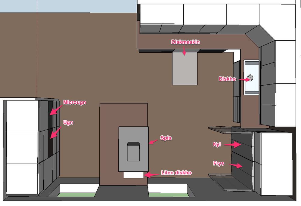 Bänkskivan både i köks-ön och i övriga bänkar blir en laminatskiva från IKEA som ser ut som betong. Laminat är ju bra och underhållsfritt så det kändes som ett naturligt val, även om vi även kollade på naturmaterial som sten i olika former.