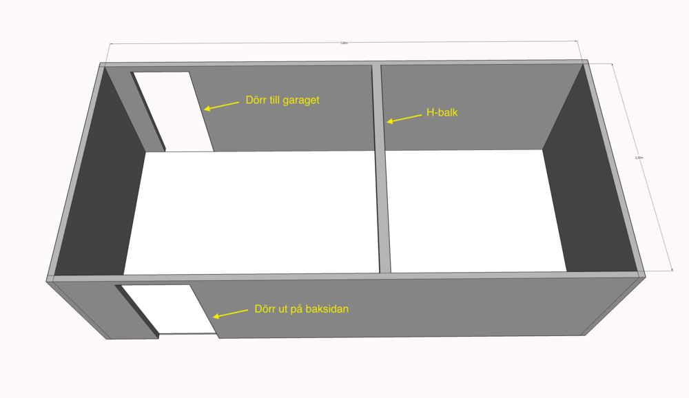 Genom rummet går en stor H-balk som inte lär flytta på sig i första taget. Sedan har vi två dörrar i en ändan. Annars är det fritt fram för fantasin