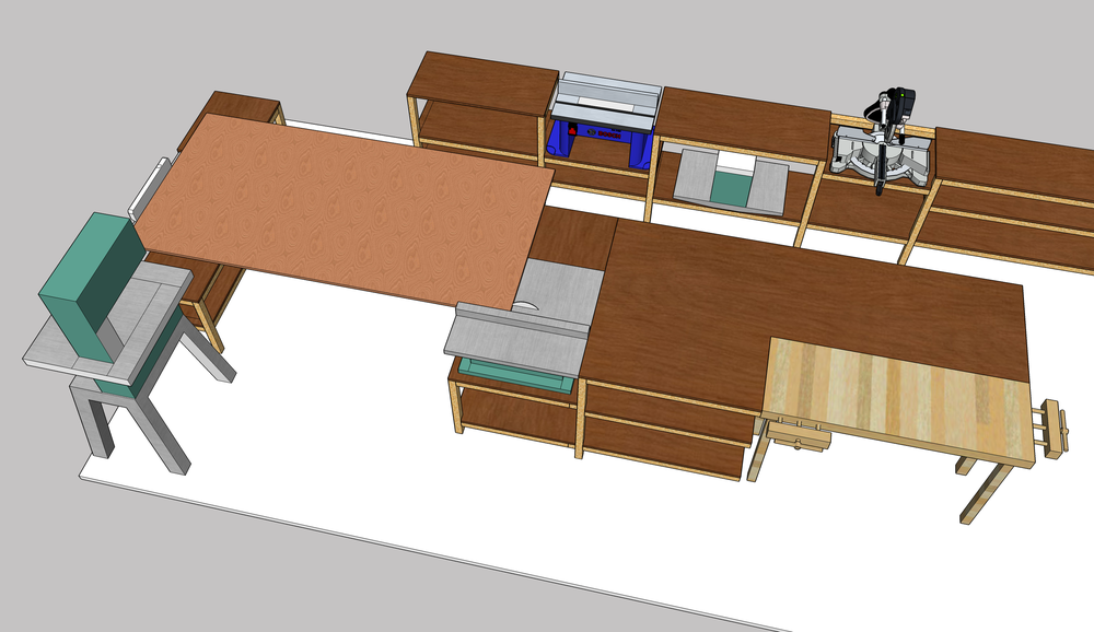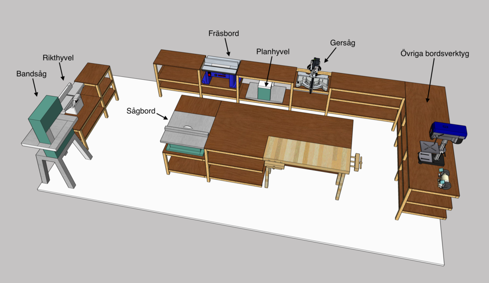 Placeringen av verktyg är tänk som så att gersågen ska givetvis vara på långsidan (där jag har den idag faktiskt) tillsammans med fräsbordet som inte har någon nivåreglering. Under det bordet placeras planhyvel som då står på en hylla som kan dras fram vid behov, det är ok att den inte är i bänkhöjd.