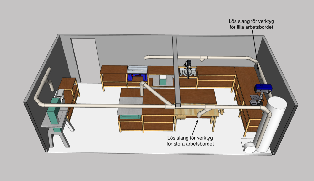 Sedan kommer vi ju till spånsugen. Idag har jag en jätteliten ståendes under ett bord och en massa flexrör dragna överallt, men det blir stopp i dem hela tiden och jag vill skaffa mig en riktig spånsug. I skissen här har jag dragit rören över maskinerna längs med väggen samt undvikit 90-graders böjar. Tanken är att där varje rör slutar ska det sitta ett spjäll och sedan ett flexrör ned till maskinen