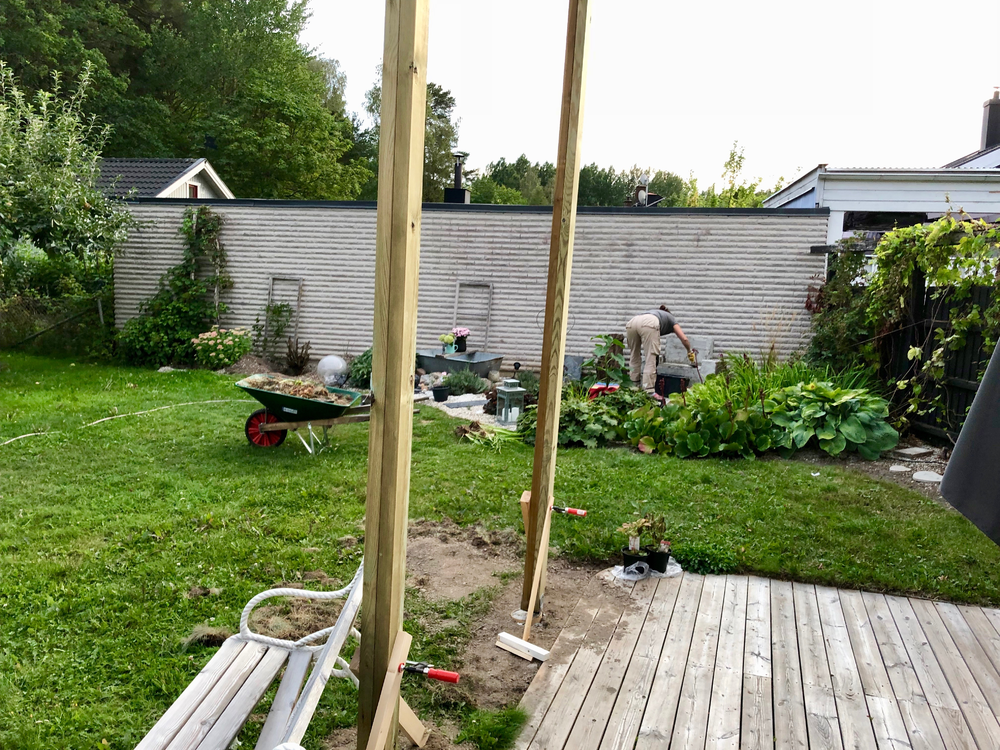 Sen gräva tre hål i gräsmattan precis utanför altanen