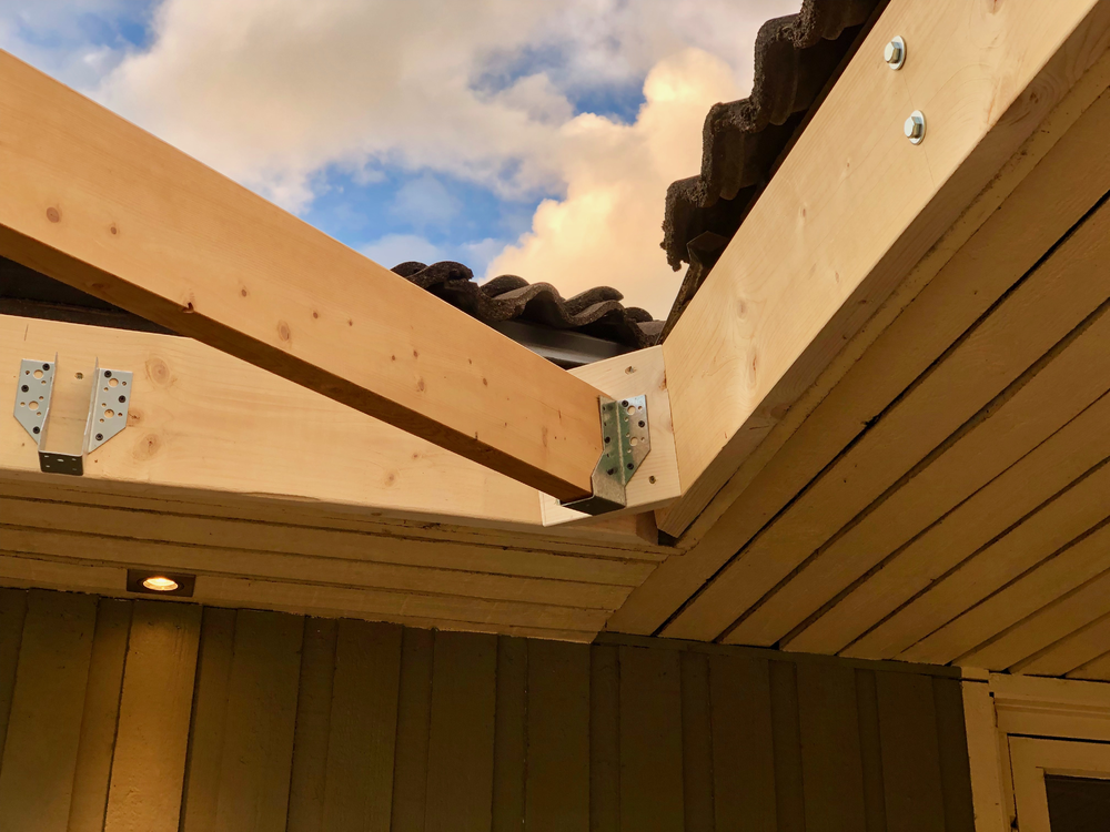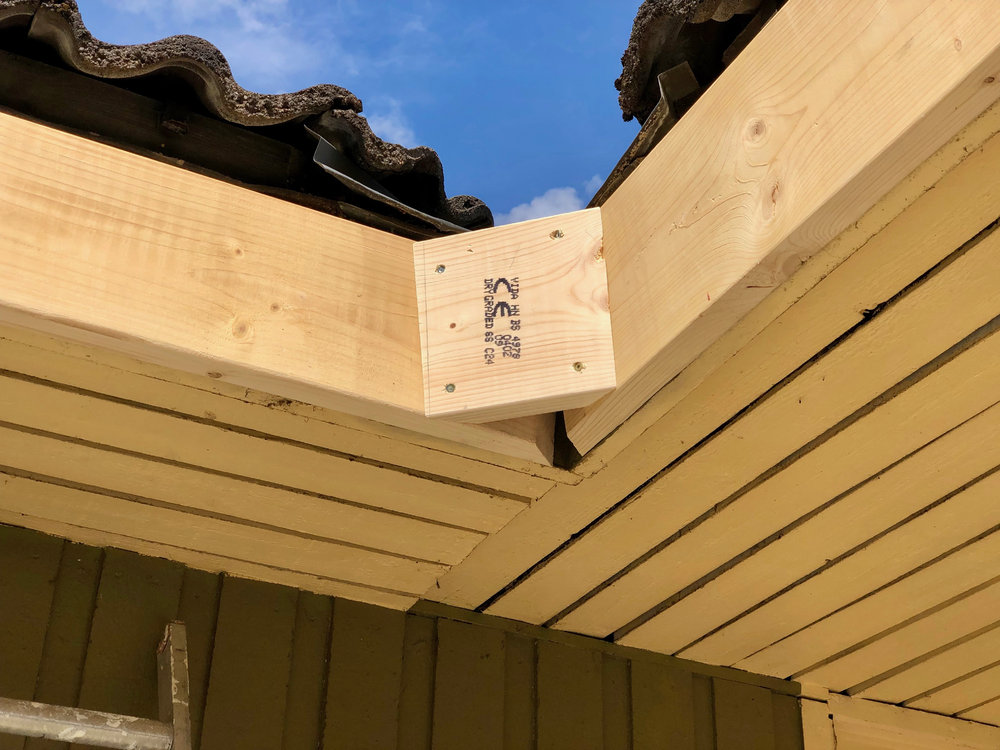Sen fästs balkarna mot vinkelbalken och sen på med råspont. Köpte färdiga råspontsluckor så det gick rätt så smidigt att få upp dem