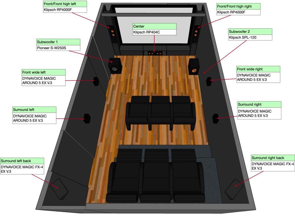 Två av dessa kommer sitta som bakre surround i rummet, i taket. Då det är begränsat just i baksidan så är detta en av de bättre valen just nu. Dom sitter i taket men då dom är kilformade så kommer dom vara vinklade inåt och framåt lite.