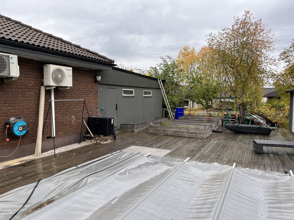 Jag hoppas verkligen vi blir klara med den här, vi vill bygga en utebar på baksidan där det tidigare varit enorma planteringslådor. Men dom ska bort, ny trall ska läggas och en utebar under tak ska byggas!