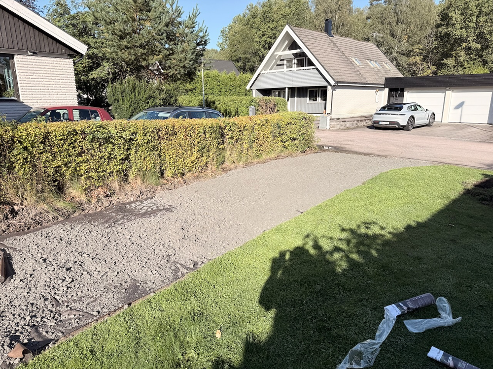 En kompis kusin hade grävskopa och ville gärna hjälpa till mot lite kompensation. Han kom över och hade ett släp grus med sig, sen grävde han ut hela uppfarten på ungefär 30cm djup och tippade i gruset.