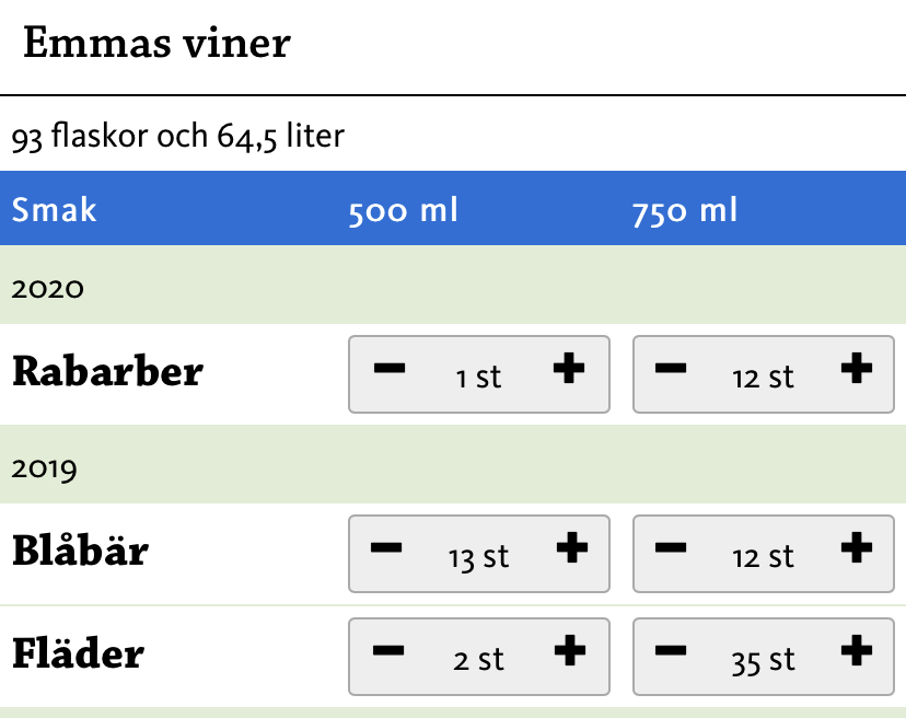 För inventering av vinet har Jonas skapat en applikation där jag kan dokumentera smak, årgång och antal flaskor av var sort. En extra bonus är att jag kan ta bort flaskor som jag dricker upp och följa hur många liter vin jag har kvar.