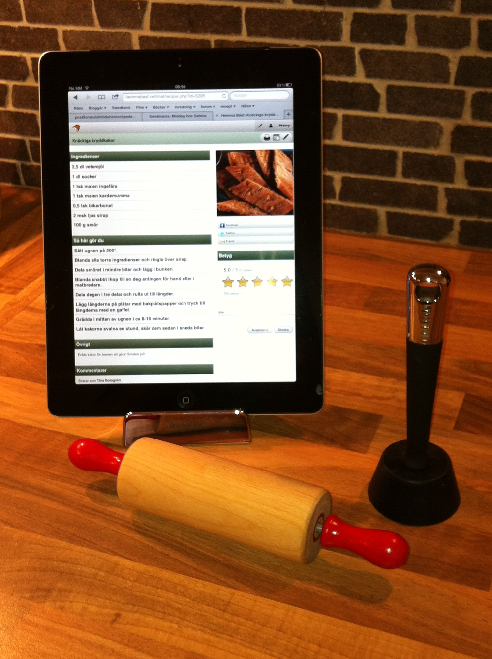 Jag fixade ett ställ för iPad i köket från Belkin som heter just "Chef Stand" som är en tung metallbas som iPad:en står i och en "penna" som man kan använda för att peta på skärmen vilket är perfekt om man är lite kladdig!