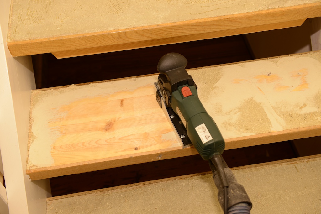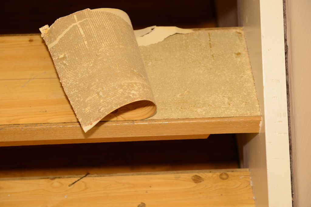 En närbild på trärena trappen. Lite ironiskt är det att dom en gång i tiden lade en linoleum-matta som såg ut som furu.. på en furutrappa.