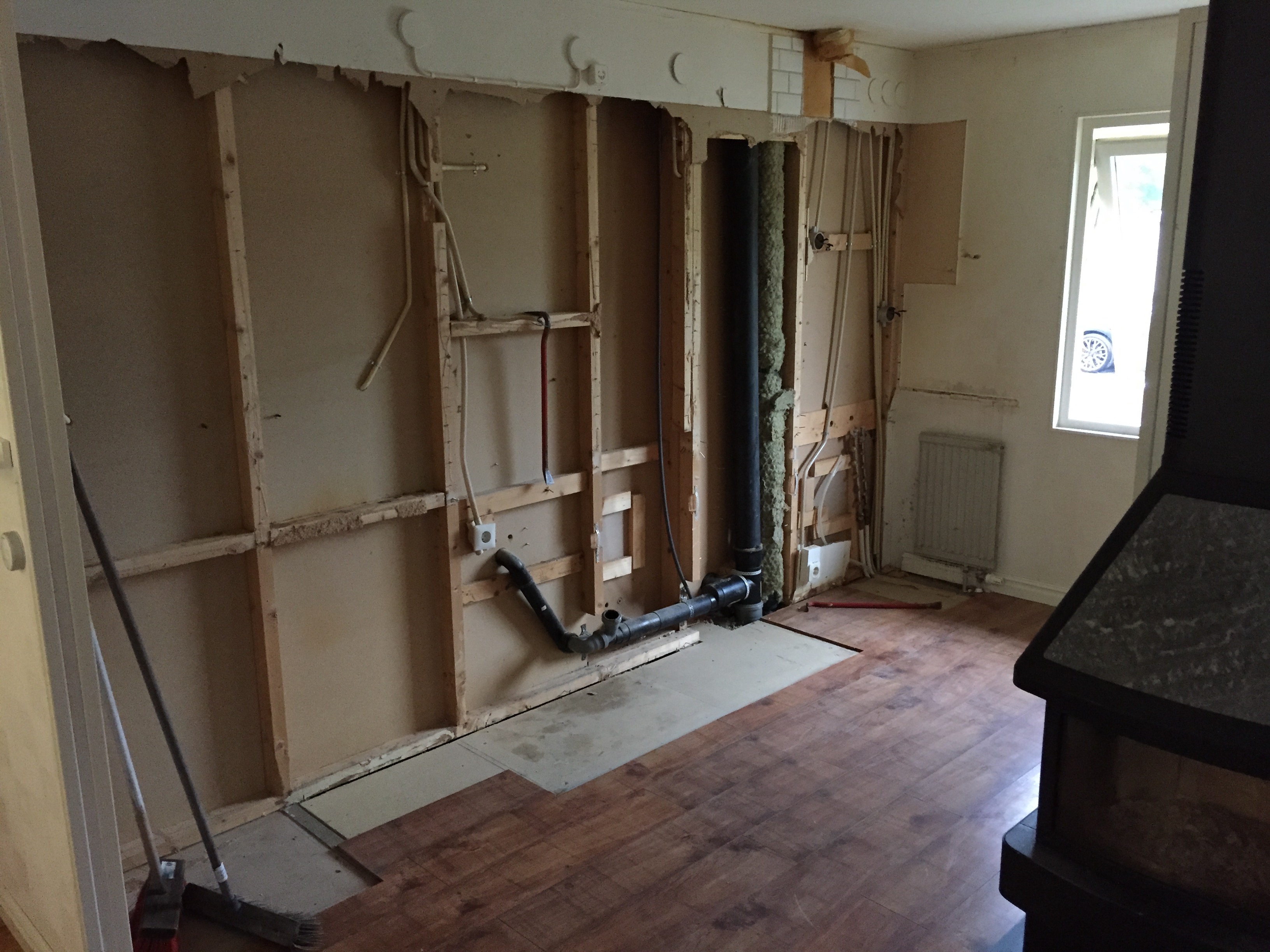 Igår fick jag hjälp av en kompis och även sonen med att riva ned hela köket och plocka ut allt i badrummet bakom det. En hel del slit men med släpet parkerat utanför så var det smidigt att slänga allt skräp direkt.