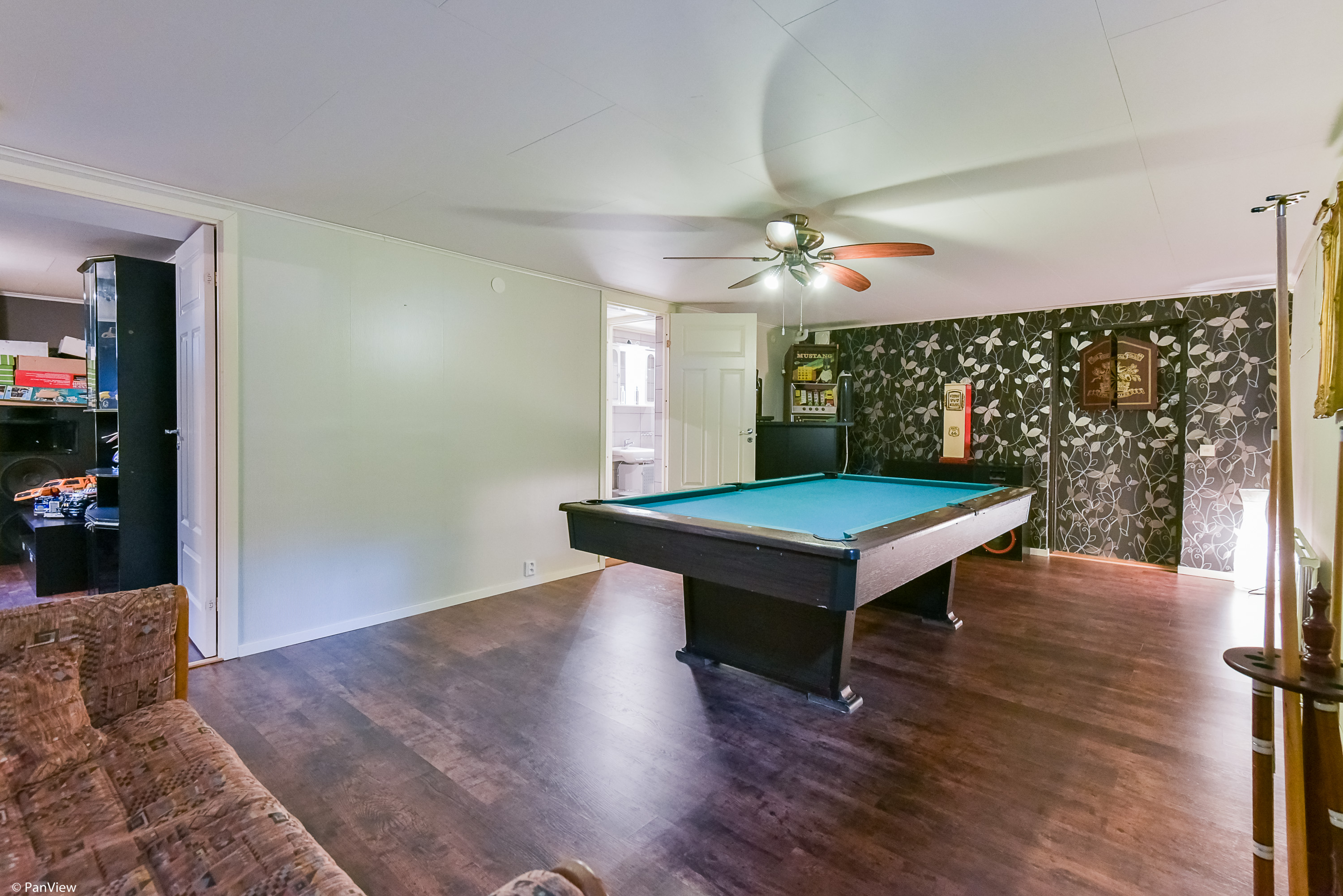 Inte nog med att vi ska renovera köket, vi ska även bygga ett ordentligt biorum. I förra huset så hade vi en bioduk i vardagsrummet som vara elektrisk och kunde dras ned. Men i nya huset så var det ett stort rum i källaren som förra ägaren har haft som biljardrum, så här såg det ut: