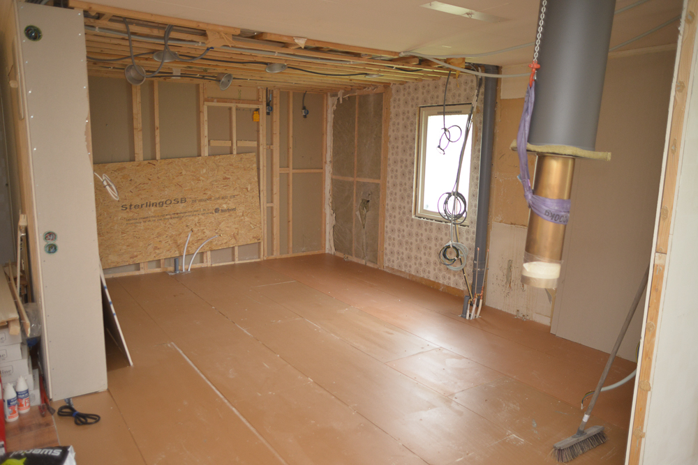 Tyvärr hade vi beställt för lite golv så medan vi väntade på mer så fogade dom där köksinredningen ska stå, och sedan så satte jag igång och sätta upp OSB-skivor och gips på väggarna.