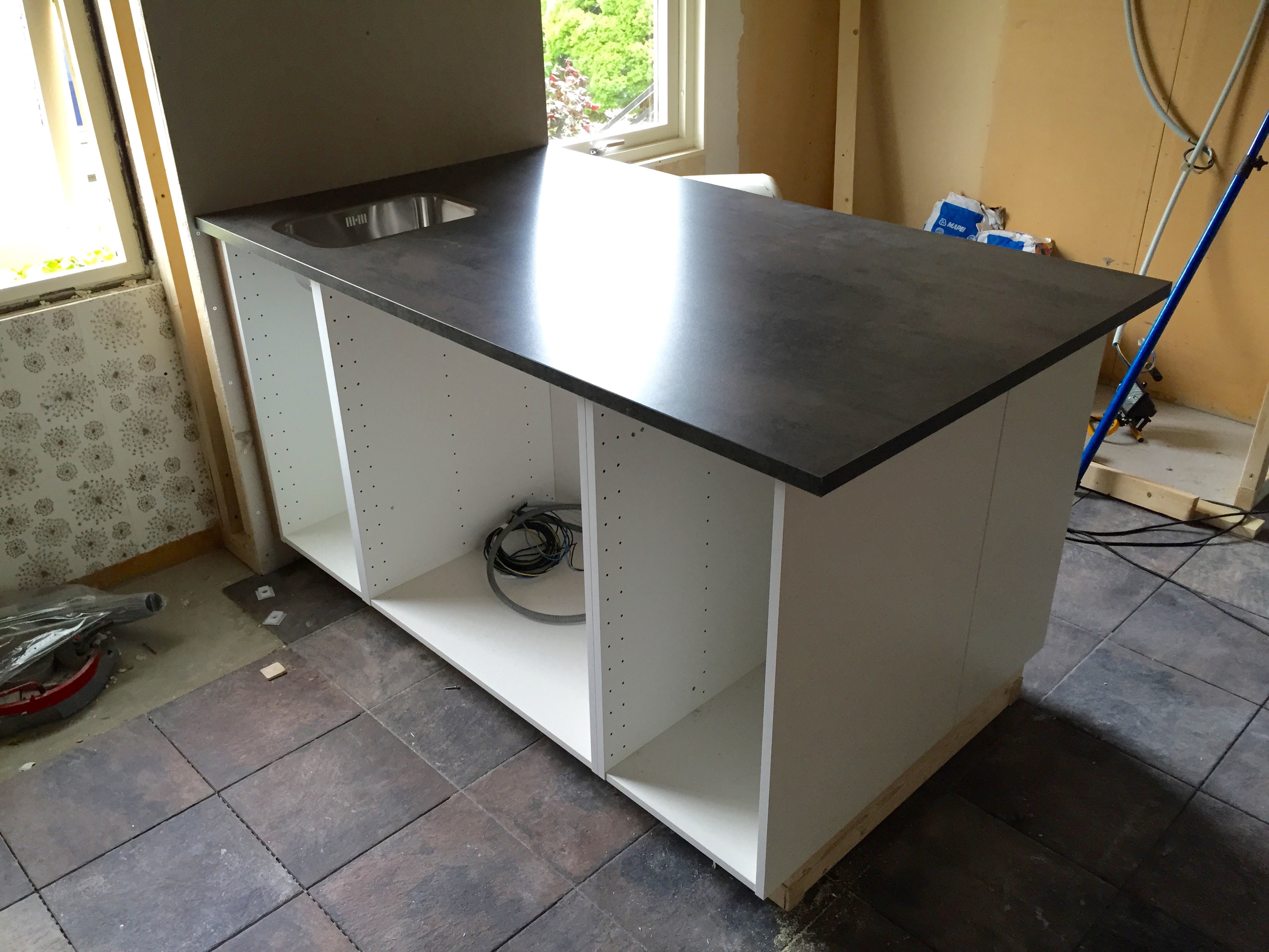 Och slutligen bänkskiva på, som håller ihop de två raderna också. Det ska till en täcksida på kortsidan och socklar under skåpet.