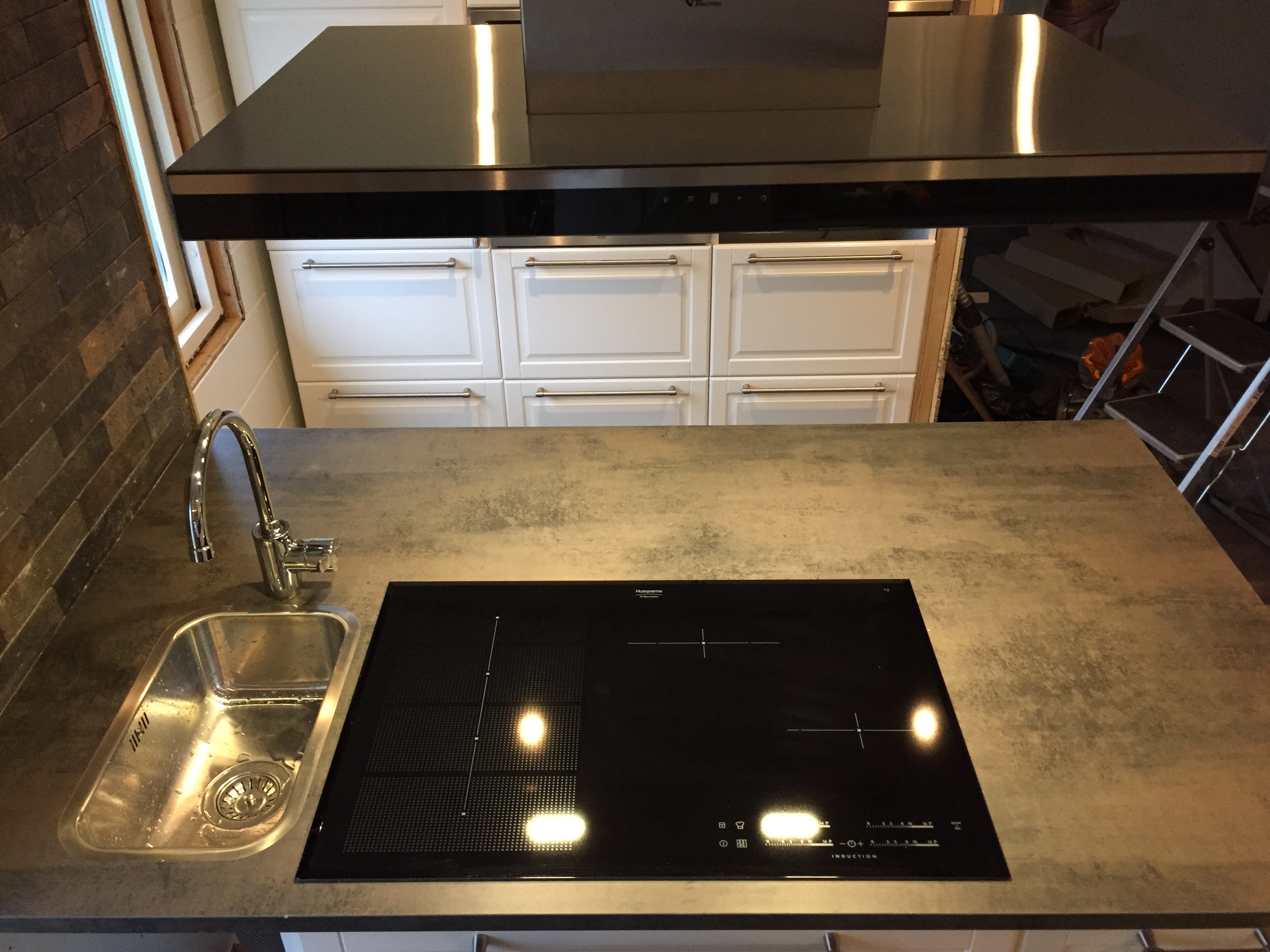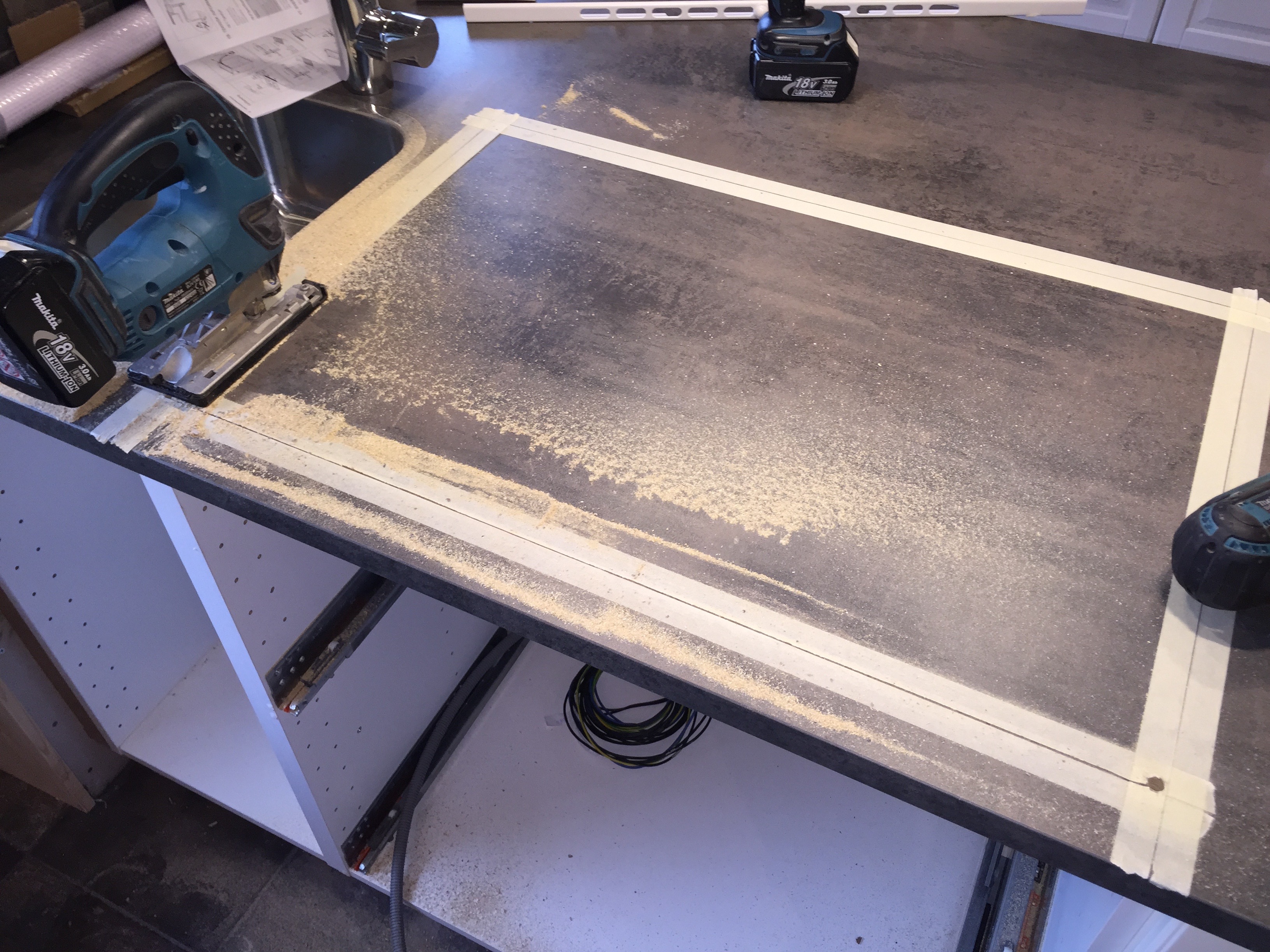 Efter att vi kaklade klart så monterades spisen i köksön, tejpade, sågade och sedan silikonade och den passade perfekt.