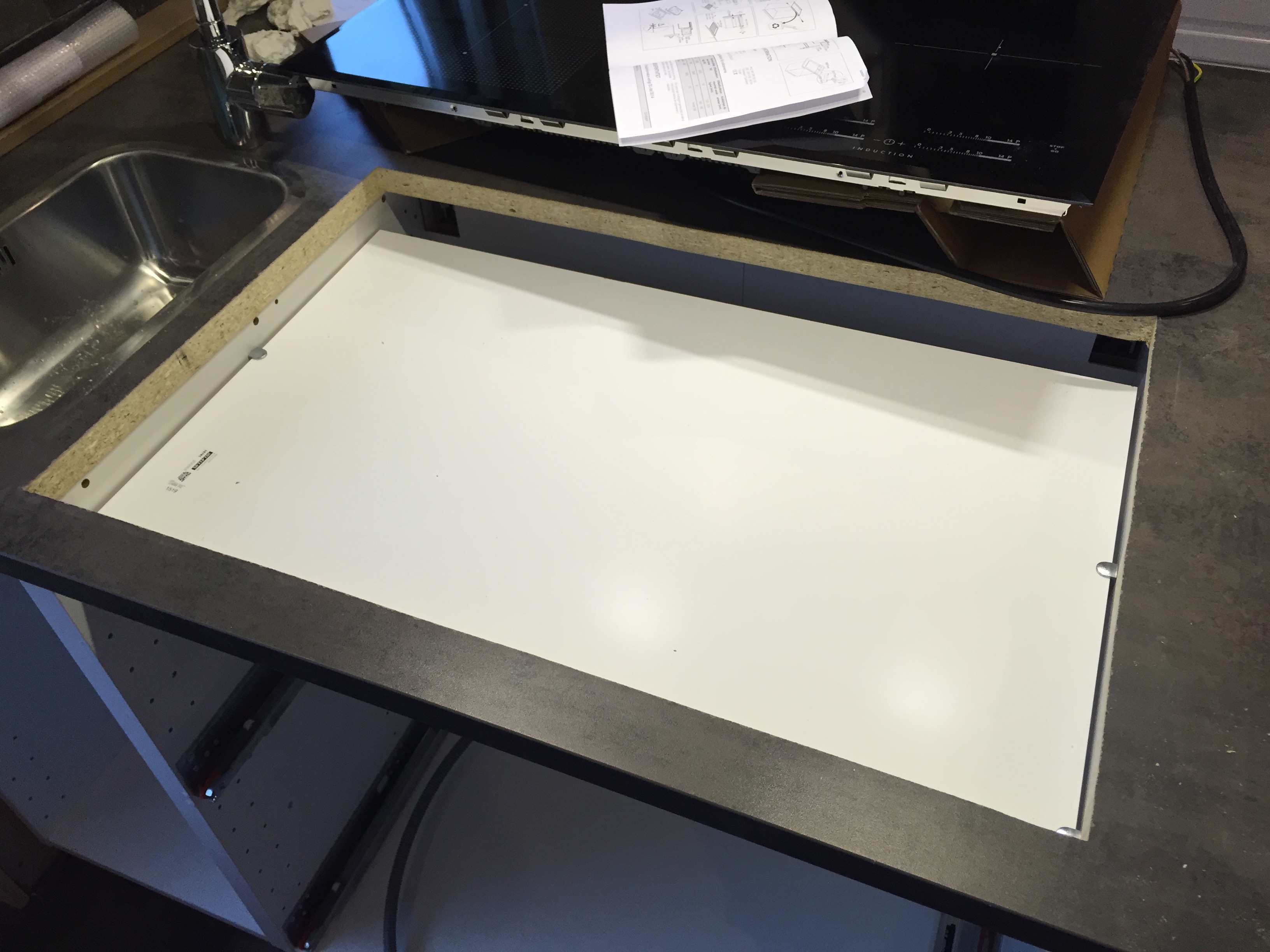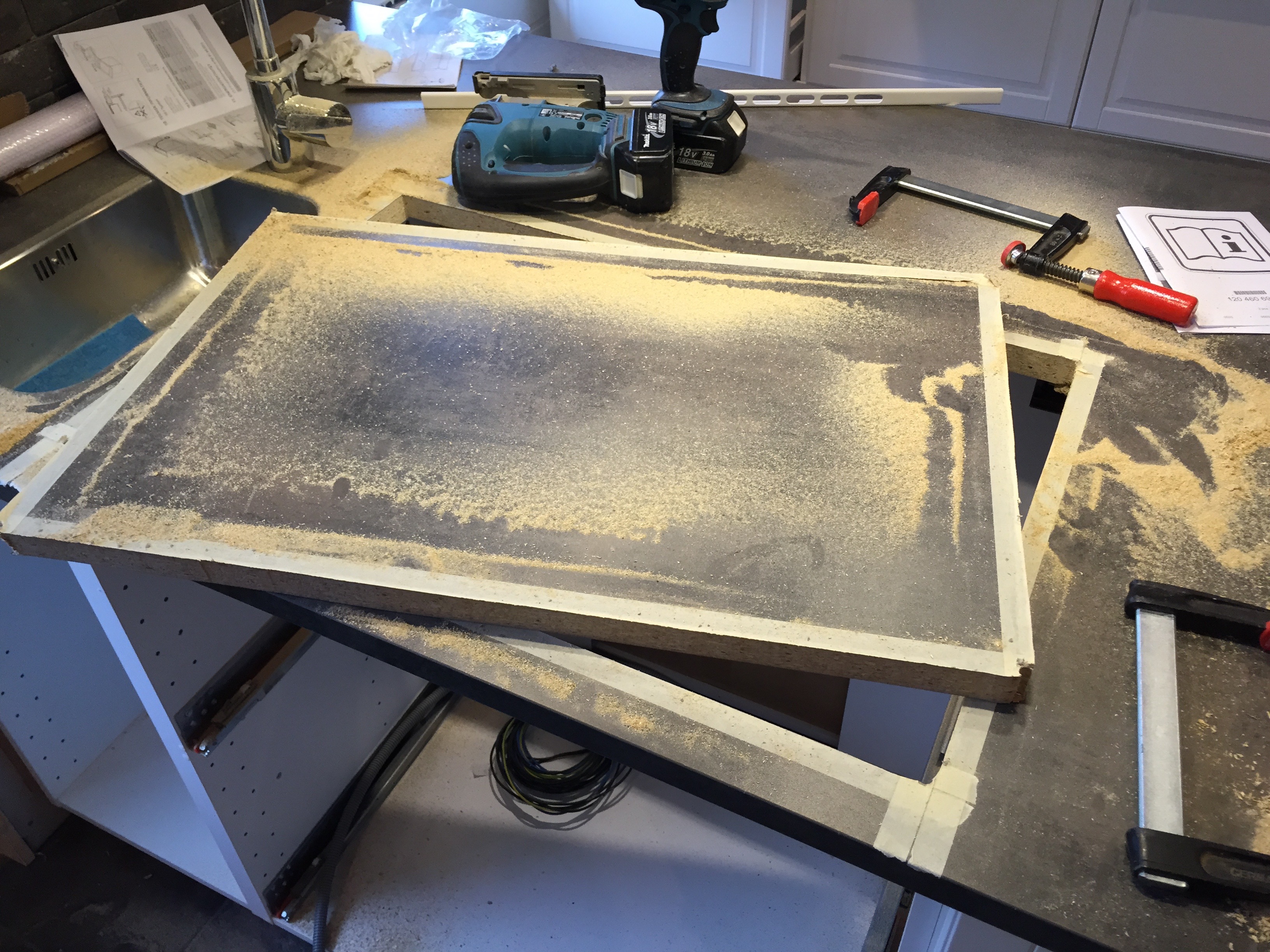 Dels så behövde jag fixa en täcksida för "hålet" under micron, och IKEA har inga sådana tyvärr. Utrymmet var 14 cm högt och någon föreslog ett liten sådant där värmefack, för att hålla maten varm, men det kändes onödigt, så jag fick ta en träskiva och fräsa till den så profilen matchade. SOm tur var så har jag nyligen skaffat mig ett fräsbord så det var relativt enkelt att fixa.