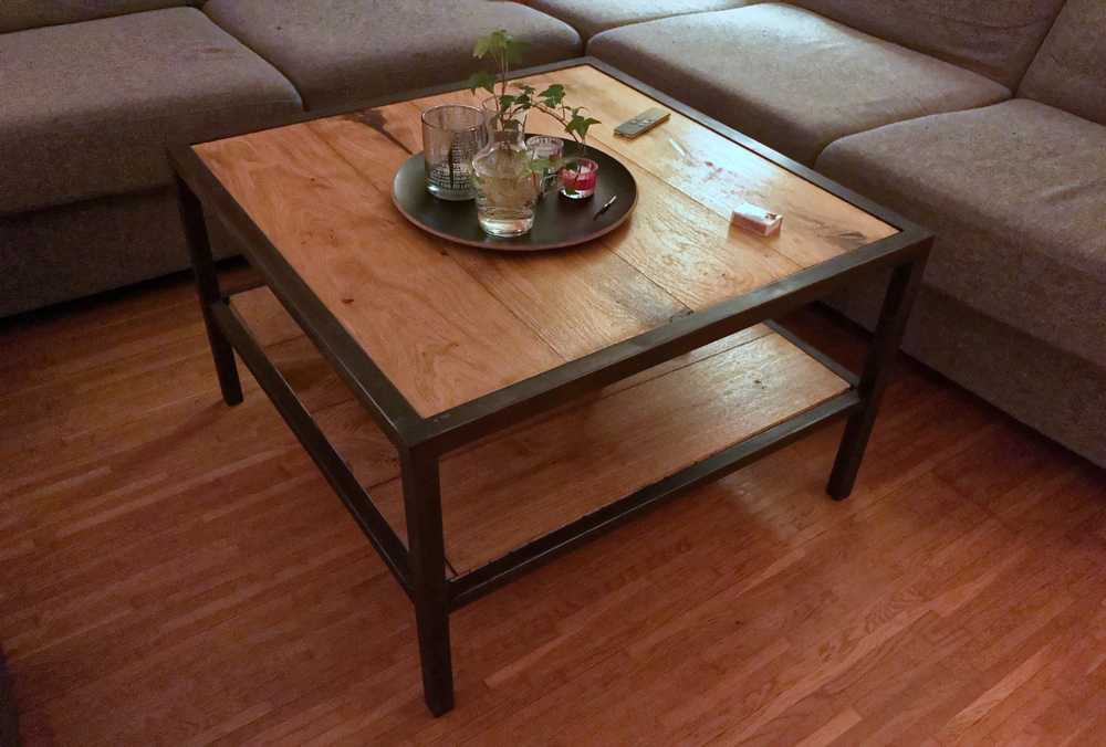 Här är i alla fall vårt nya vardagsrumsbord, skapat av 30mm stålrör samt vårt gamla golv från vårt förra hus. Vi blev riktigt nöjda!