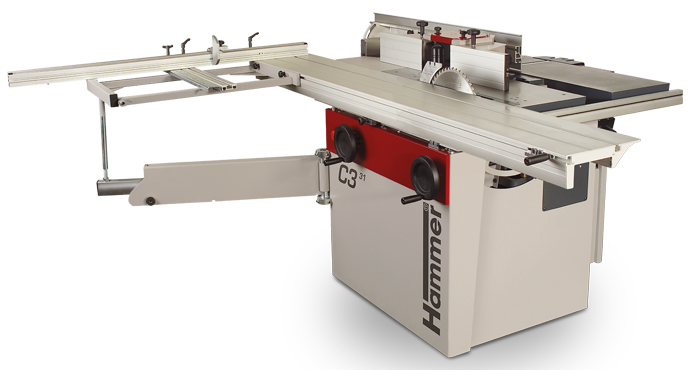 Det är en Hammer C3 kombinationsmaskin. Den har formatbord (sådan inbyggd släde), 30cm sågklinga och en slitsklinga (för att fräsa spår på upp till 19cm breda). Då det är en kombinationsmaskin så har den även inbyggd vertikalfräs samt rikt- och planhyvel, så många av de hobbymaskiner jag har hemma kommer ersättas av denna.