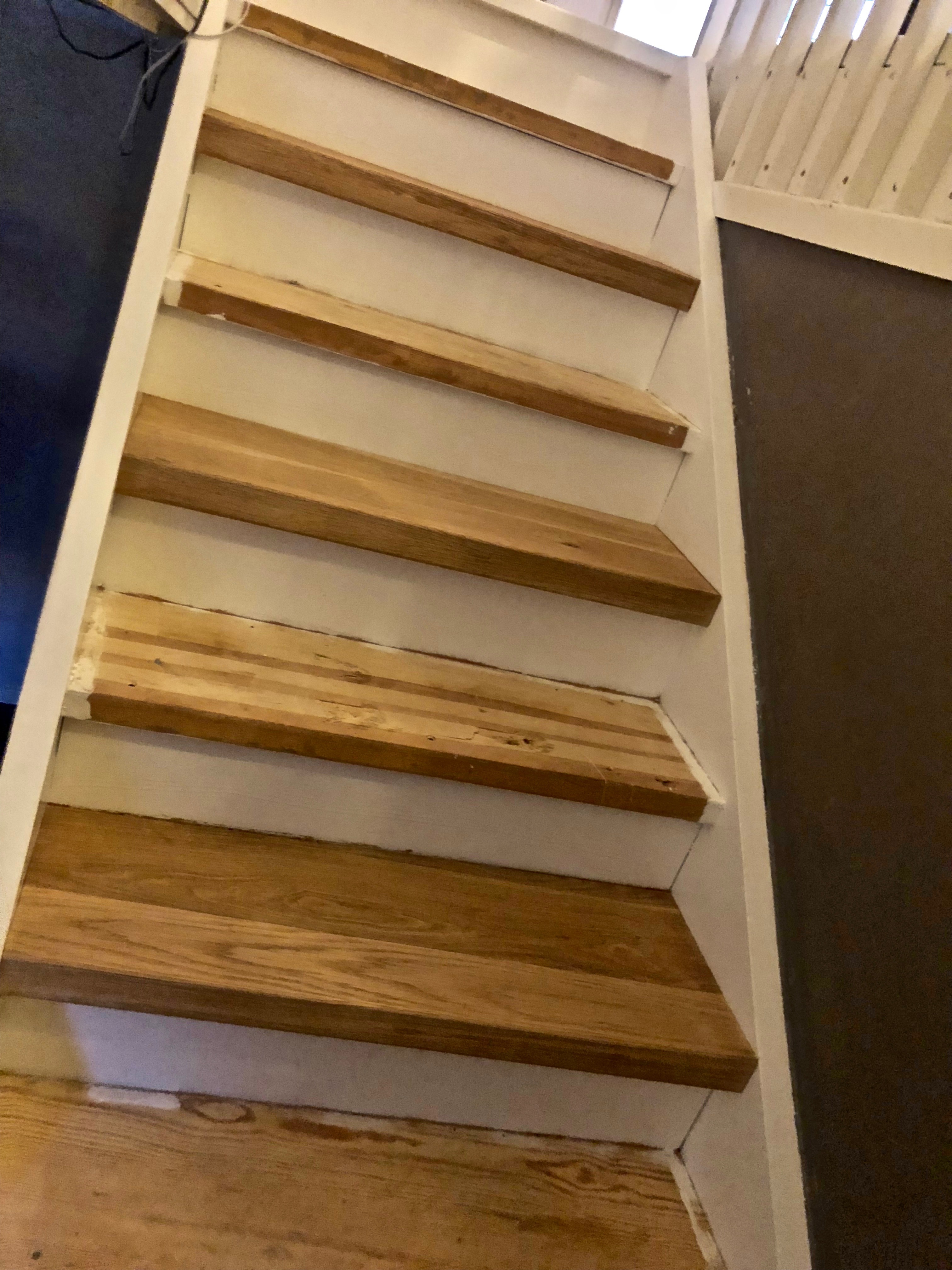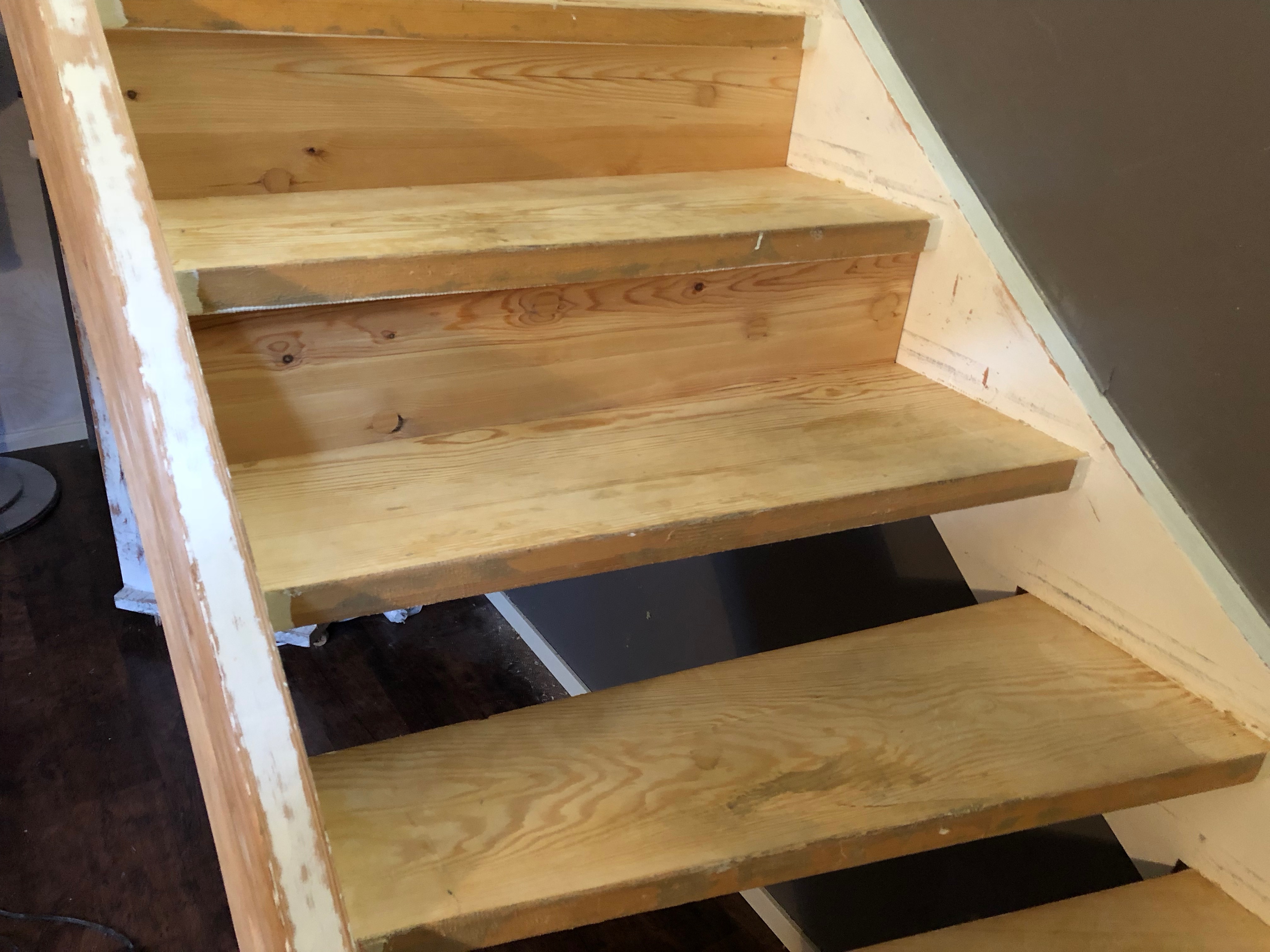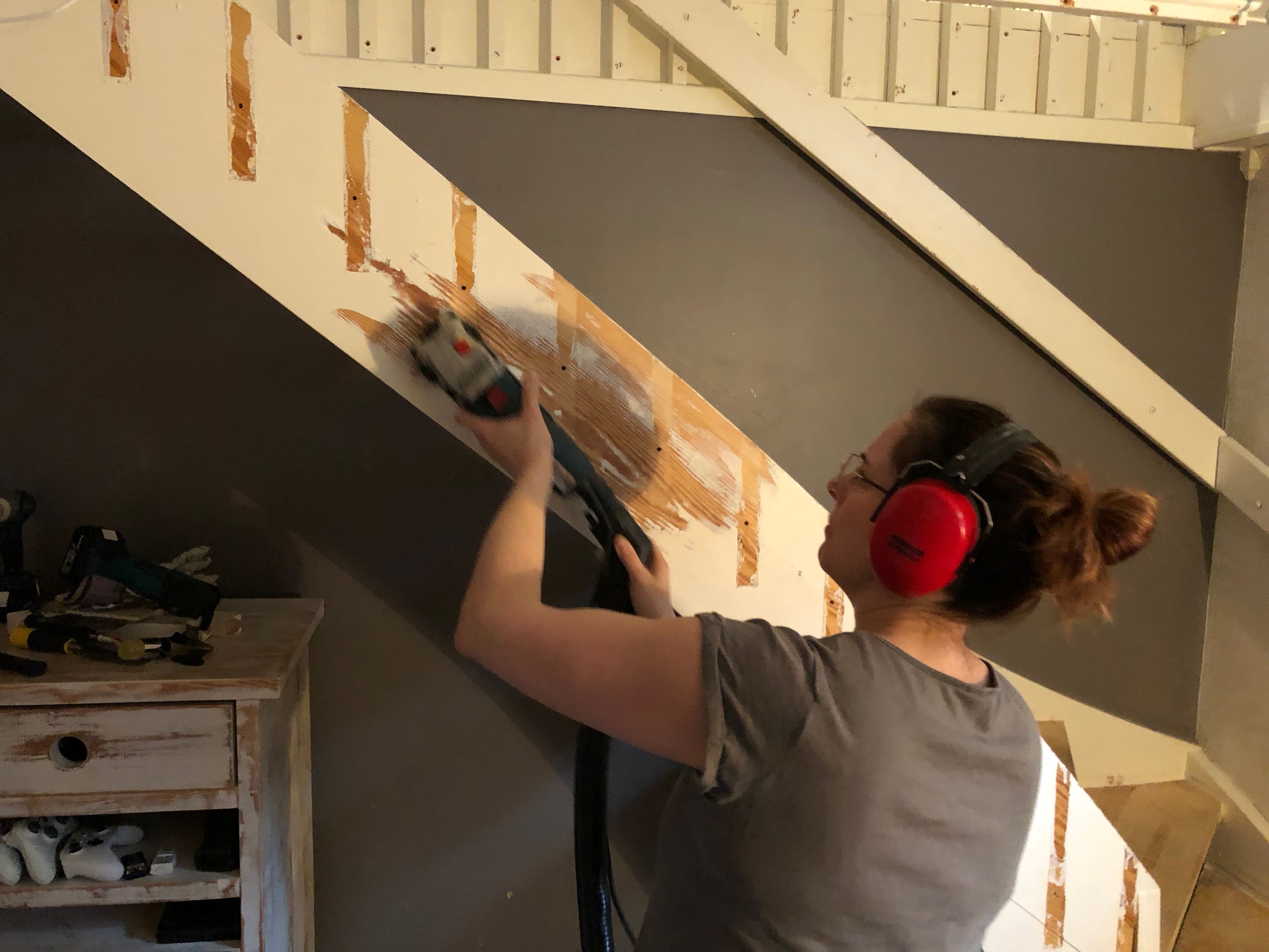 När vi flyttade in i det här huset 2015 så fanns det mycket vi ville fixa. Med tiden så blev det mer och mer. En sådan grej var trappen ned till undervåningen. De flesta golven i huset är helt ok, men trappen hade tygfilt på varje steg så den skulle vi behöva fixa. Vi började med att ta bort hela spaljén och sedan försökte Tina slita bort mattan från stegen, men dom satt åt så hon överlämnade det till mig (hmmm).