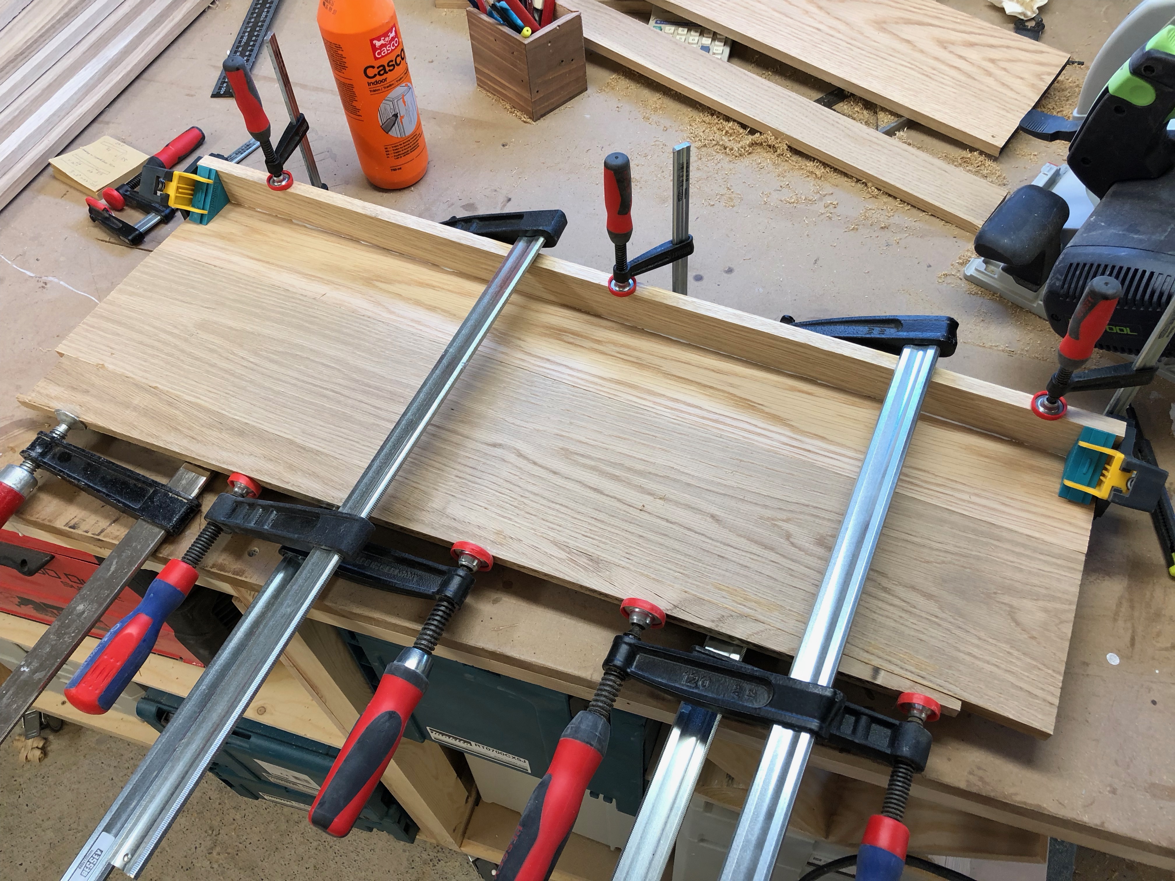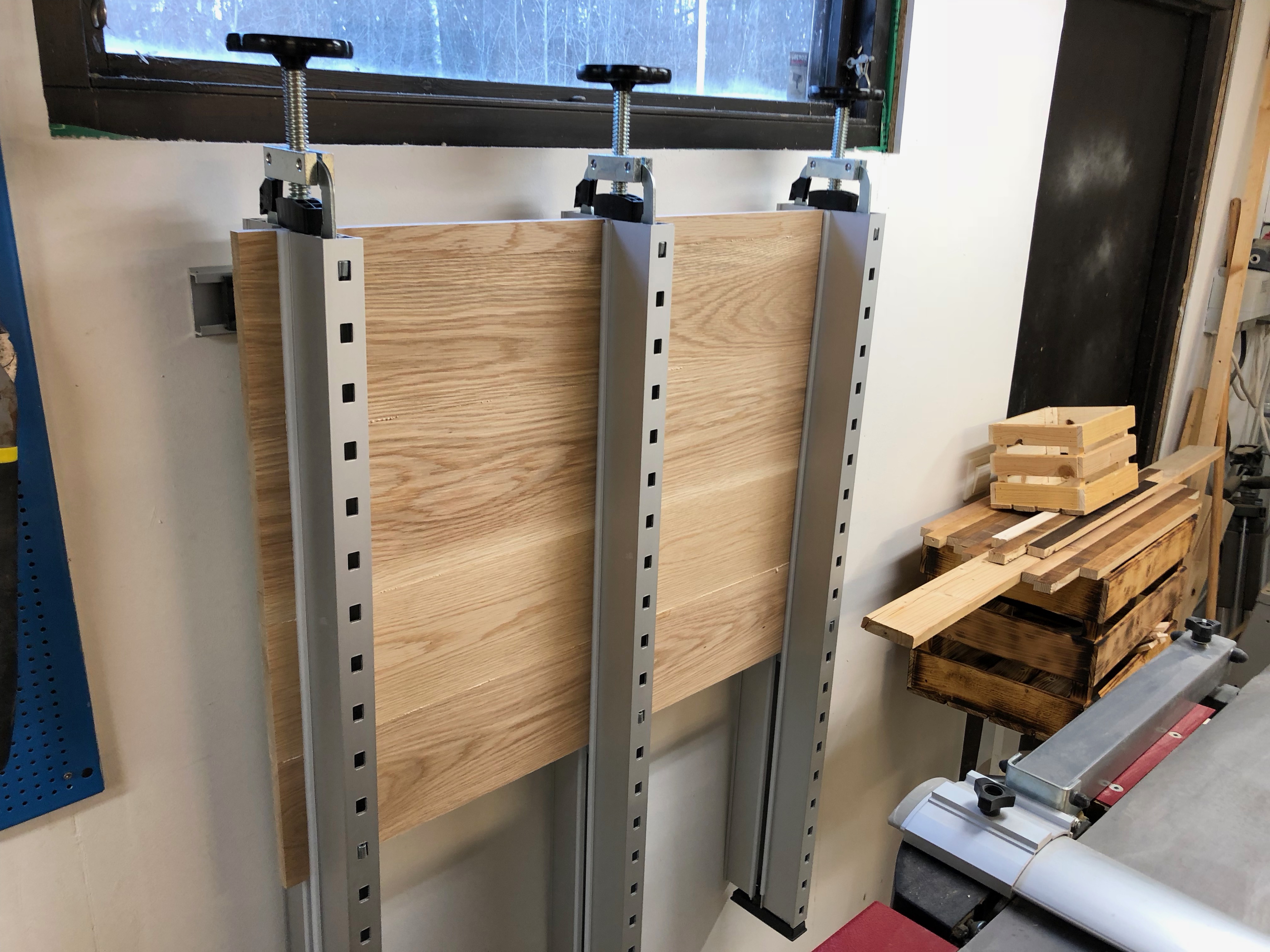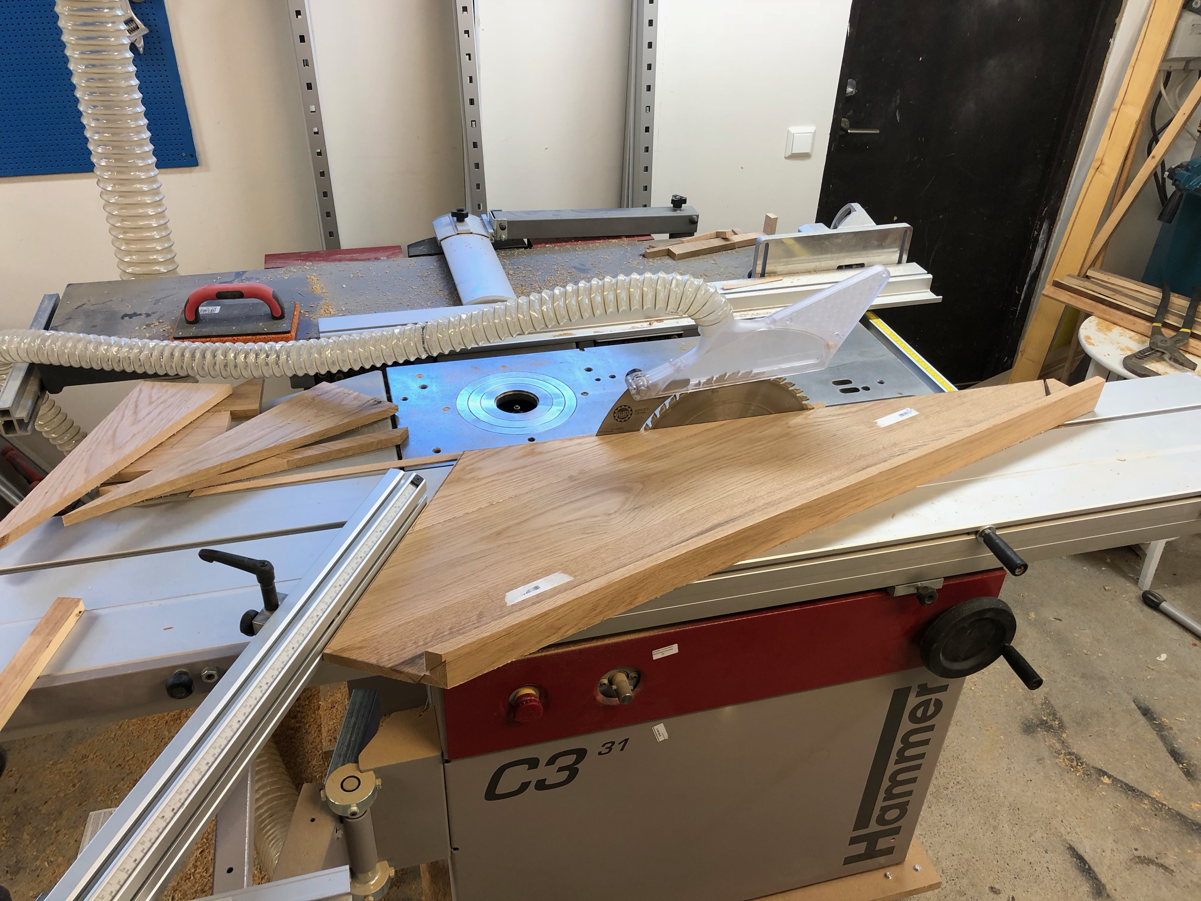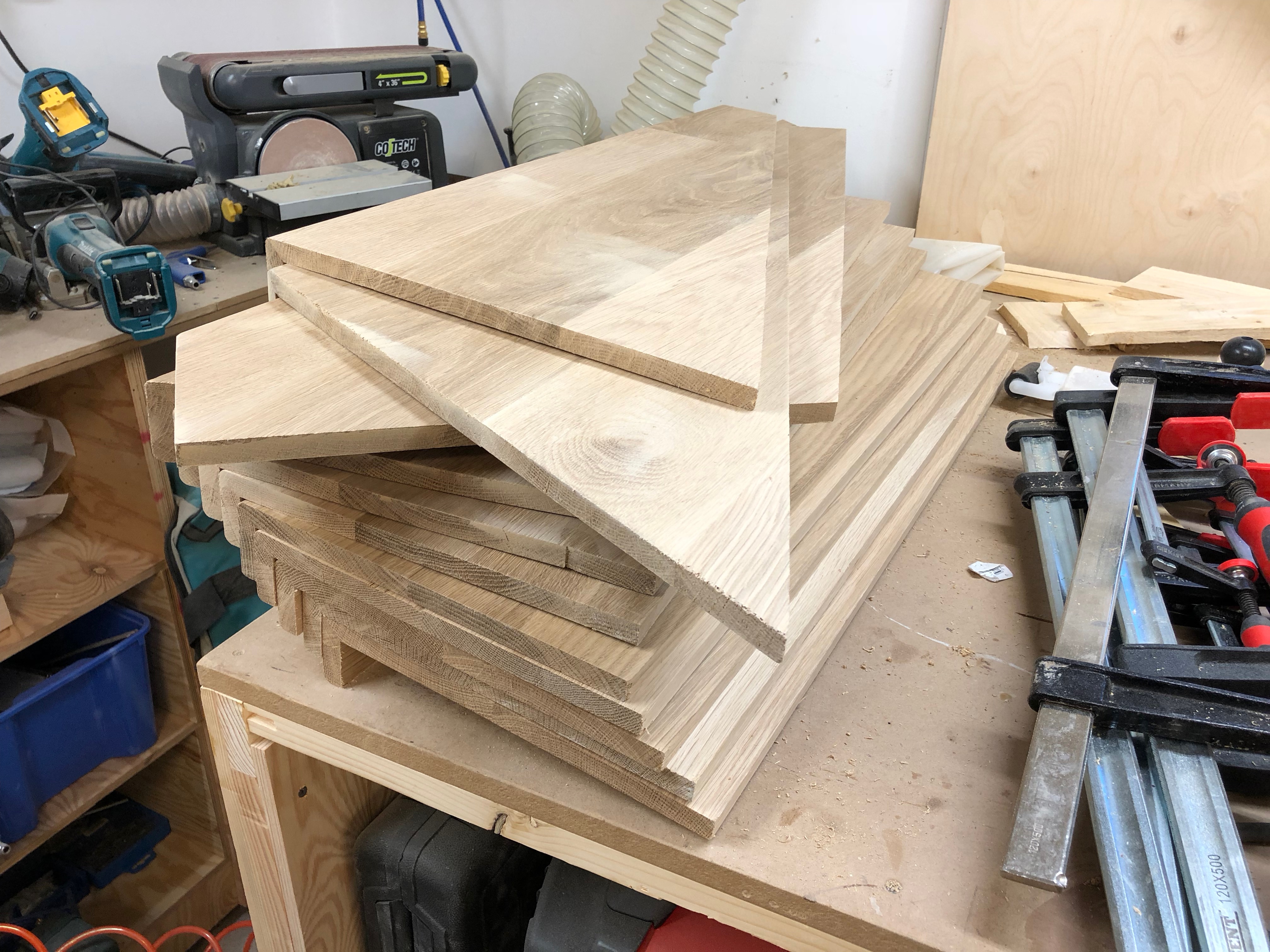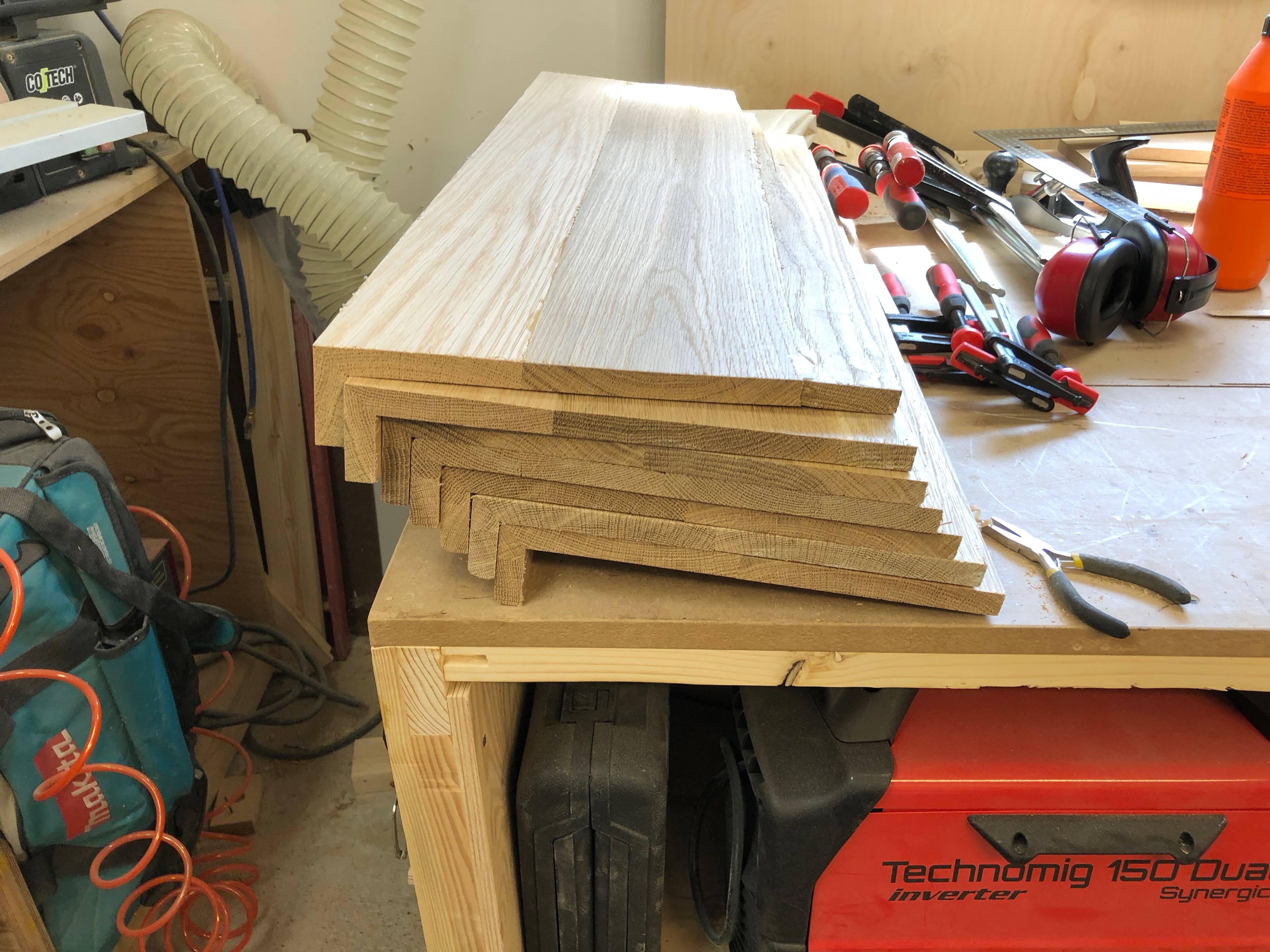 Priserna för sådana kit ligger i regel runt 15-20 000 kronor, och då är det inte ens massivt trä, utan någon form av plywood med ekfanér på. Nej, bättra än så kan vi! Jag har ju en fin verkstad, så jag beställde planhyvlad ek från Calexico Wood som kom hemlevererad.