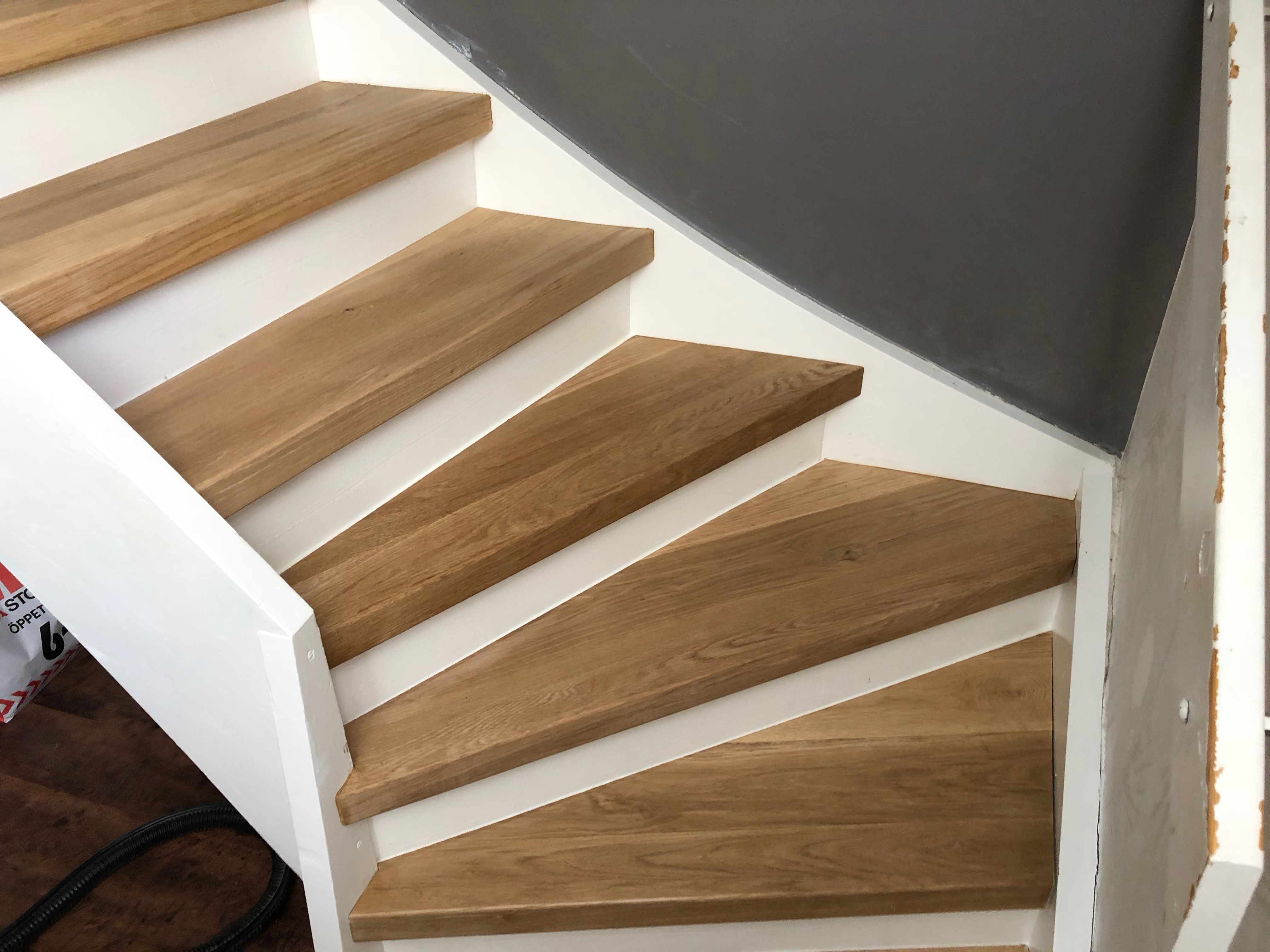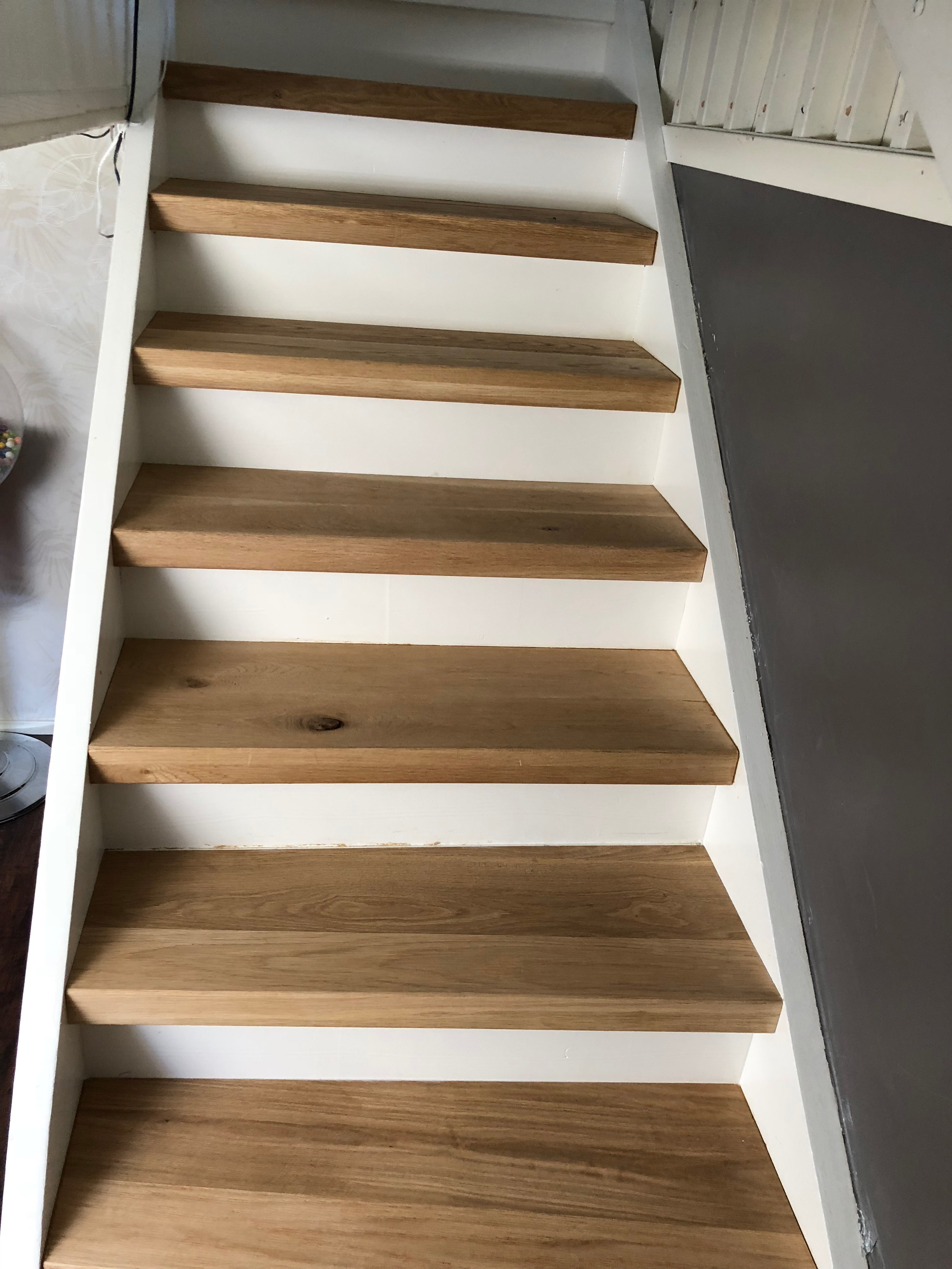 Men oj vad snyggt det blev! Varje steg är slipad, fräst och sedan borstat så att träådringen känns under fötterna när man går i den, och sedan tre lager med hårdvaxolja för att skydda den för slit och fotsvett.