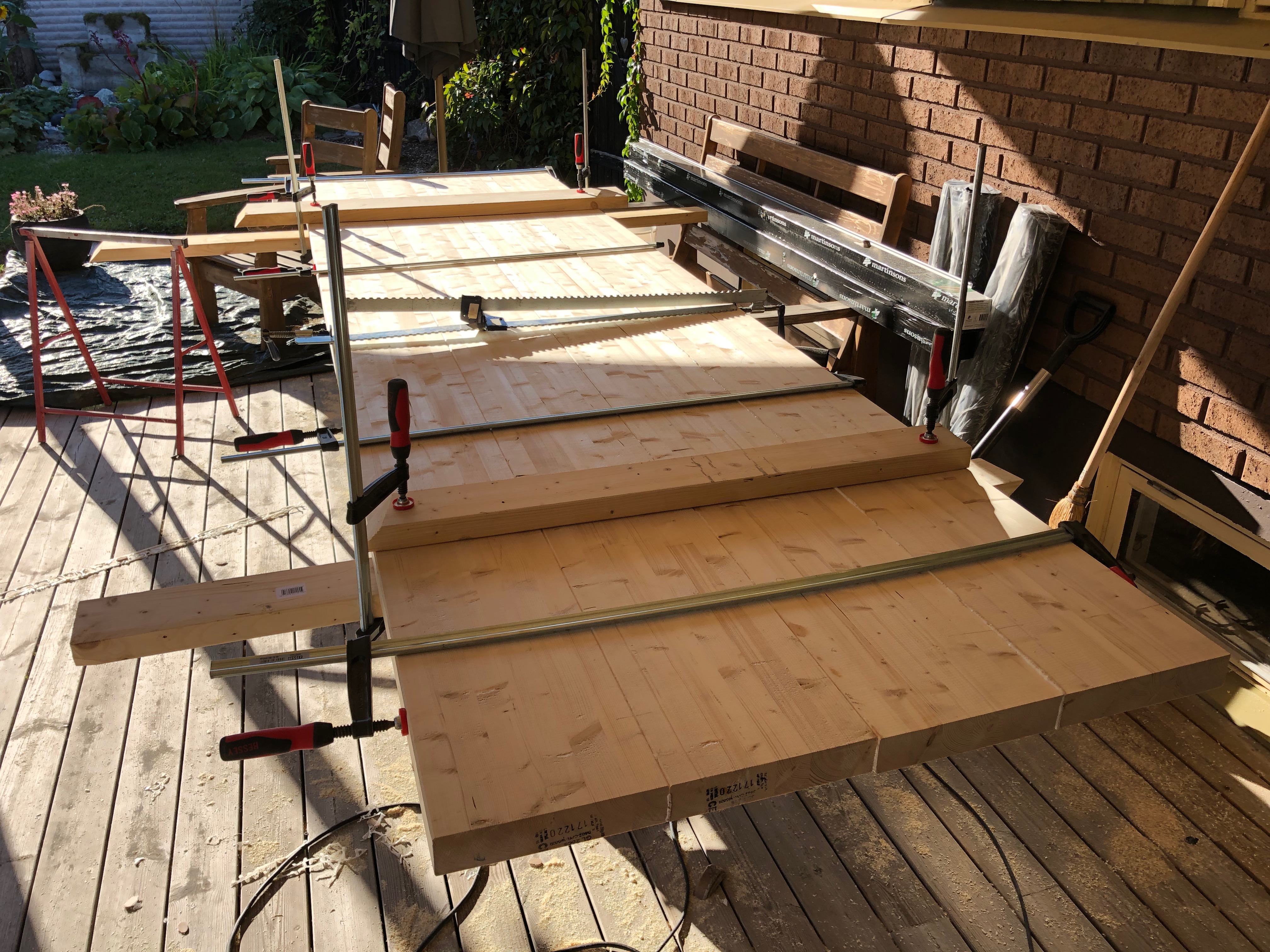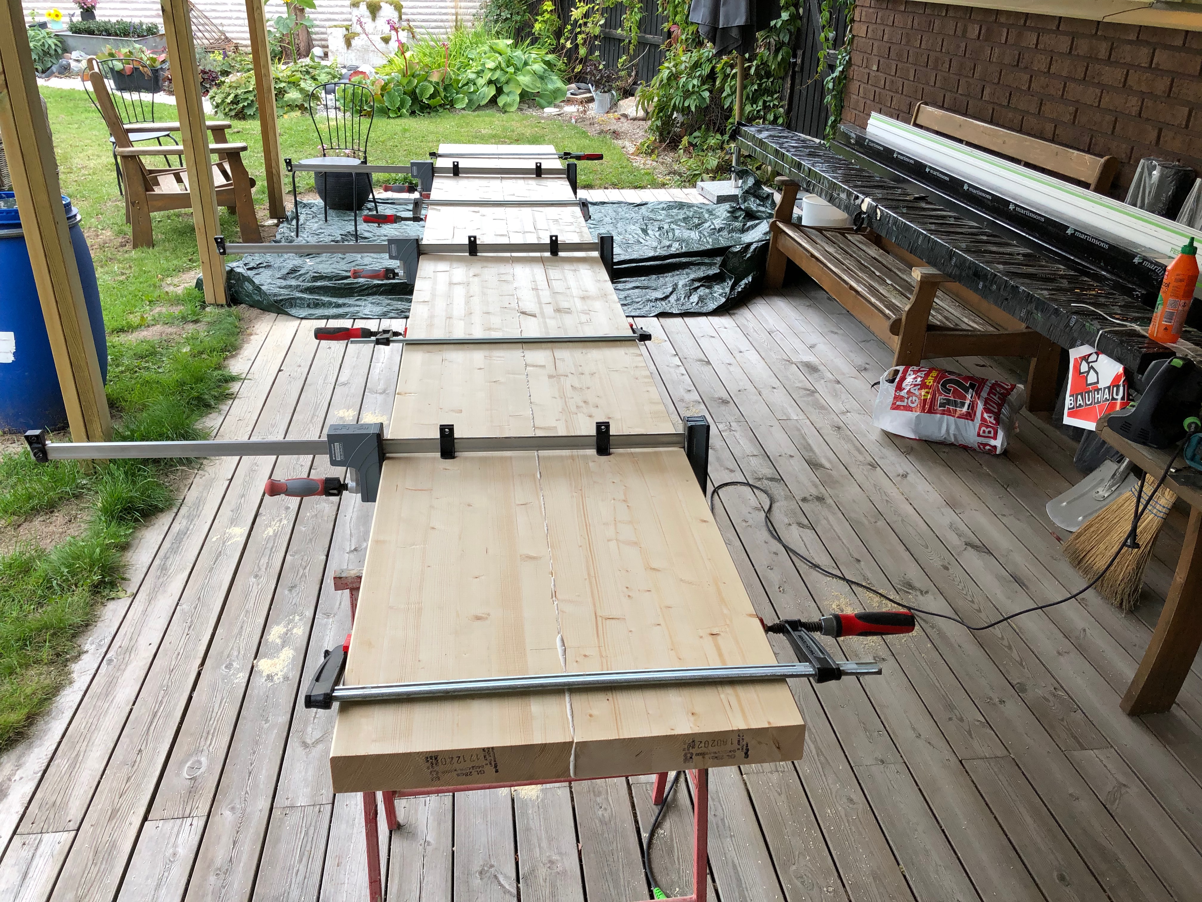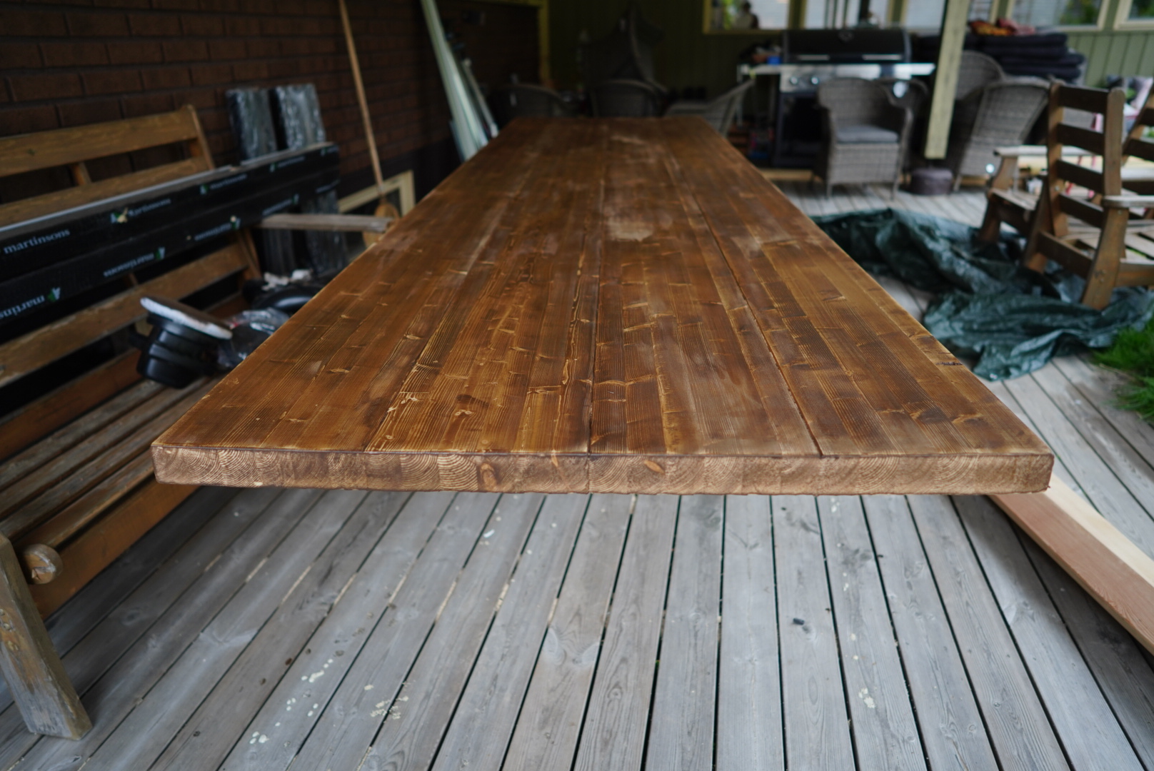Under det nya altantaket jag byggde i höstas så behövde vi ett nytt bord, så vi köpte tio nya stolar i sådan där konstrotting och så satte jag igång och byggde ett stort bord där många ryms runt. Jag valde att köpa limträbalk och använda dominos för att sätta ihop dem till en stor skiva. Limträbalk är ju rätt så formstabilt vilket var tanken.