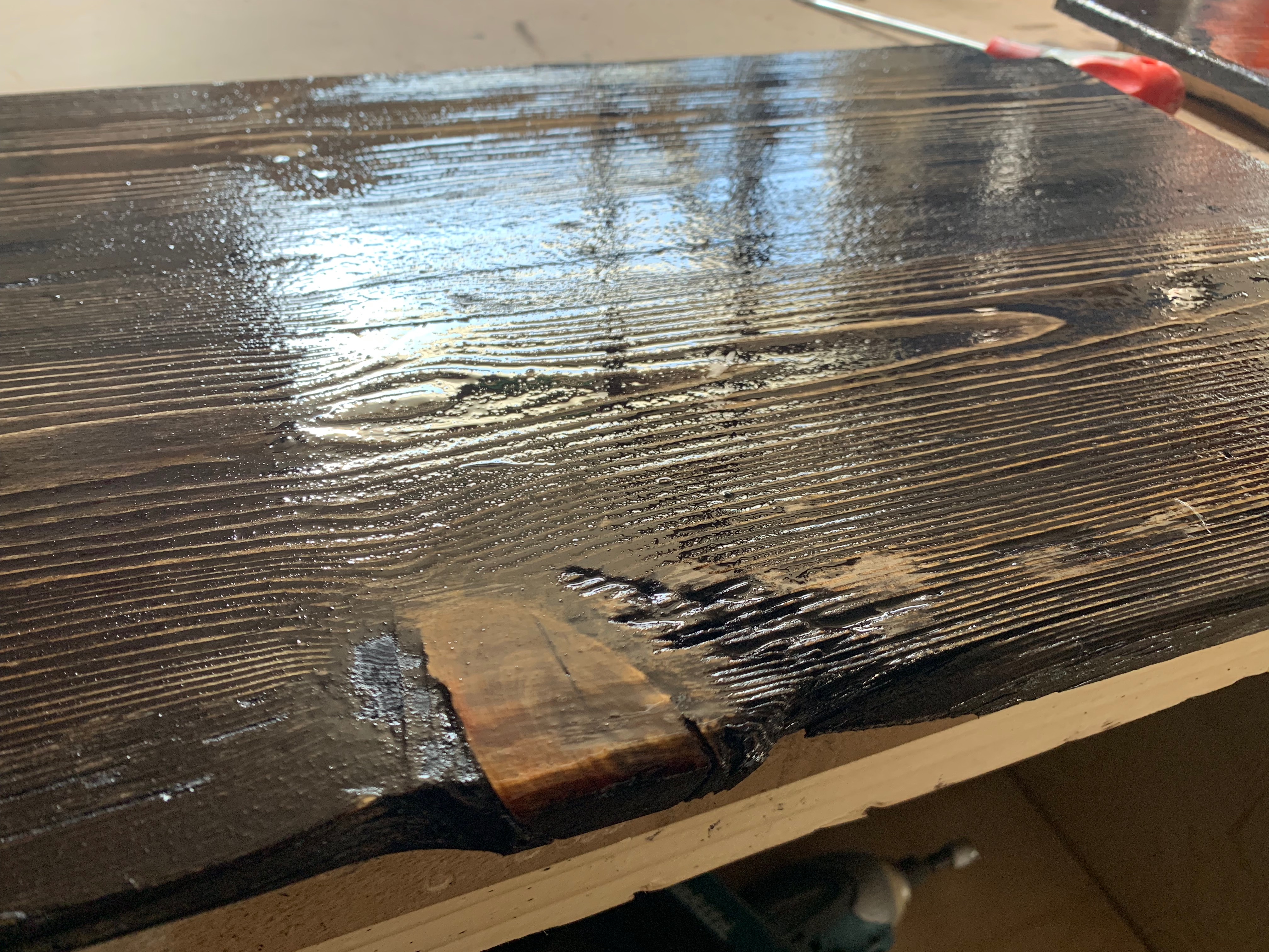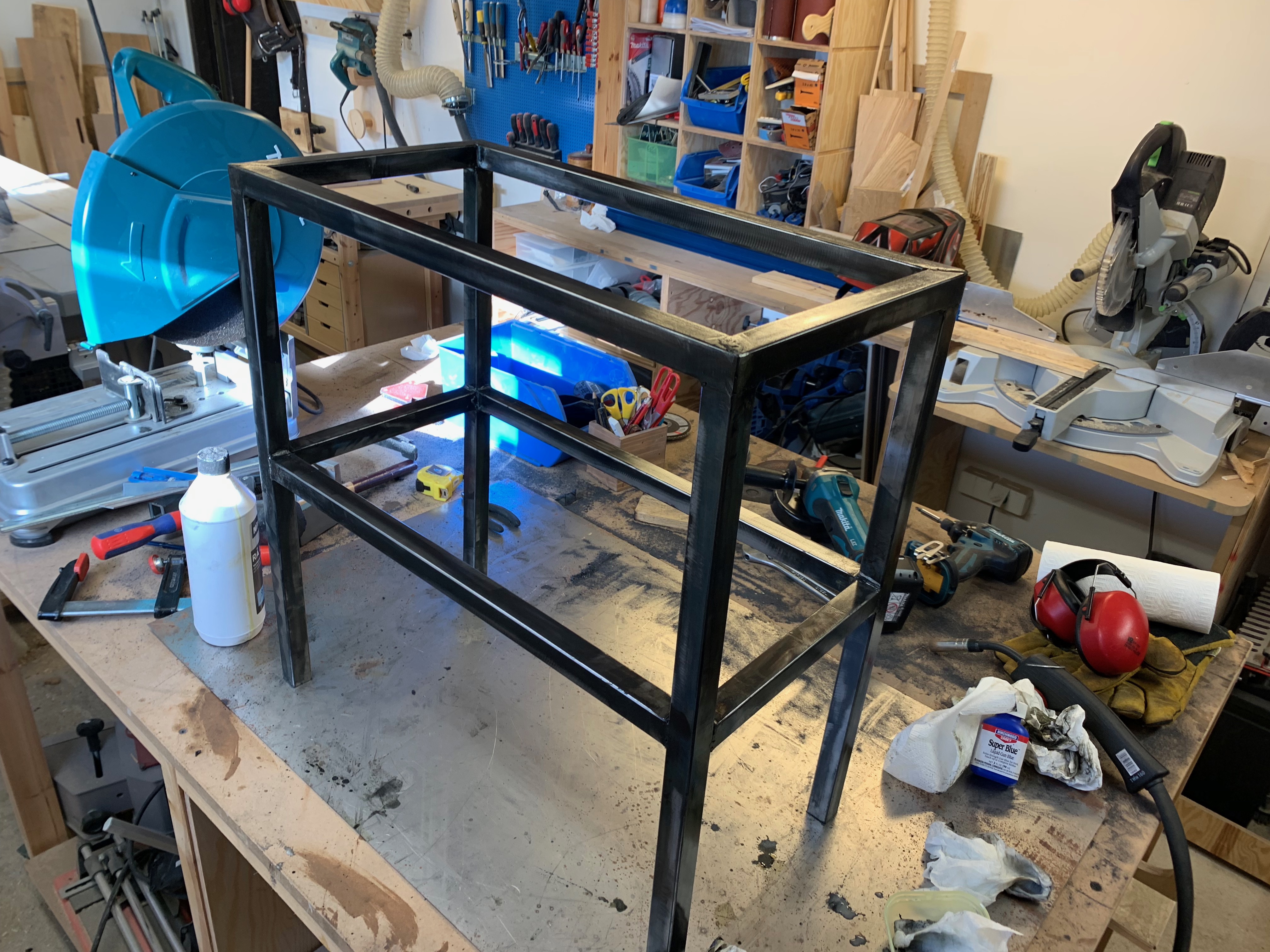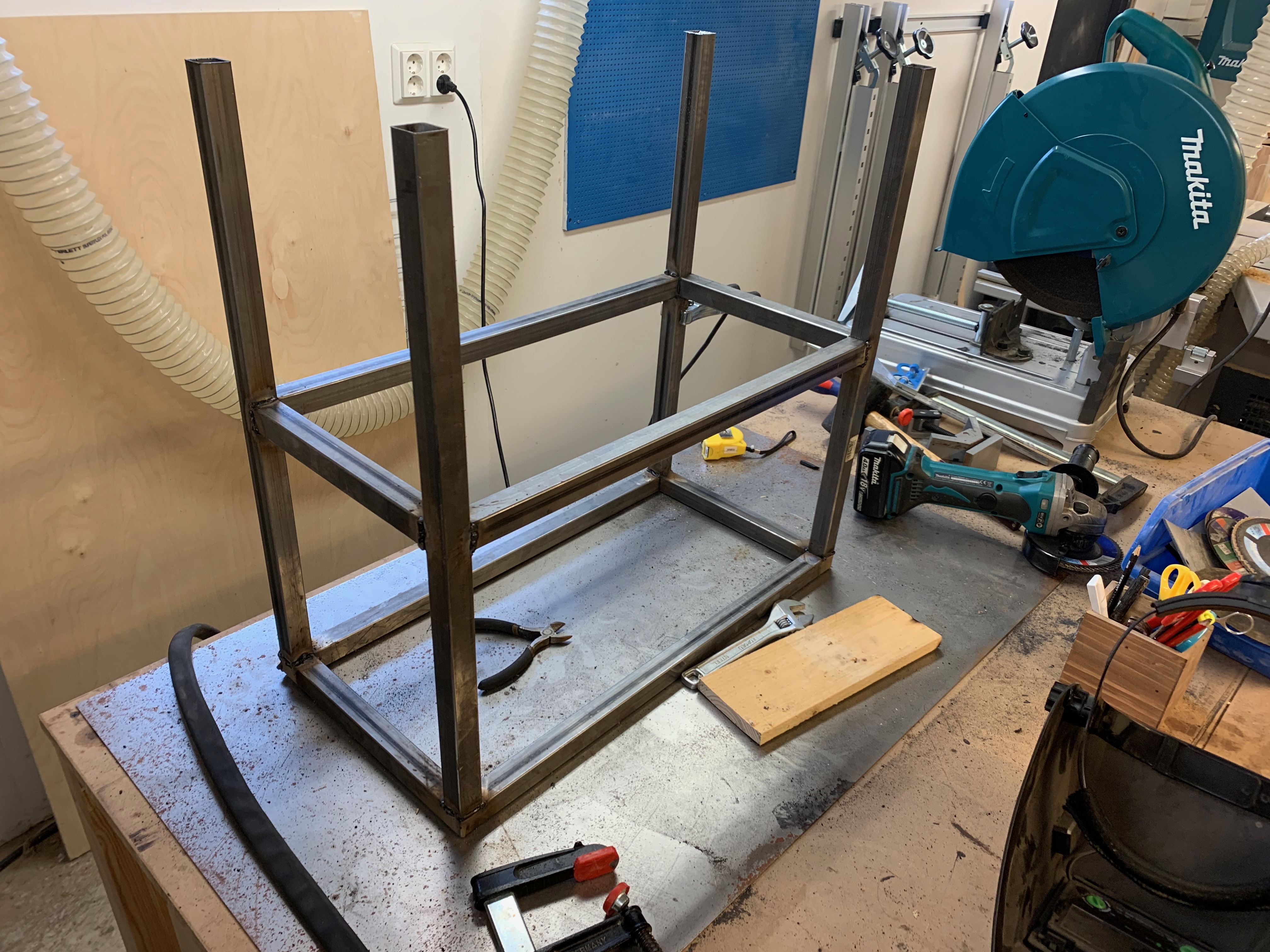 Har länge behövt ett litet sidobord inne i biorummet för chipsskålar, fjärrkontroller och sånt. Och jag har ju helt klart skapa en liten "stil" vad gäller bord hemma, så det var ju bara att spinna vidare på den, så här är bordet! Svetsade ihop lite fyrkantsrör, svärtade dem och sen skapade jag två bordsskivor av gammalt virke som jag betsade med ZAR Charcoal-bets så dom skulle bli riktigt mörka.