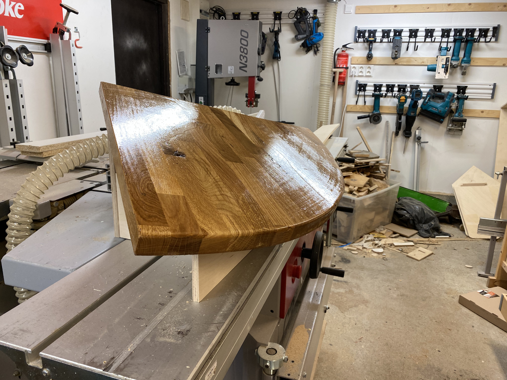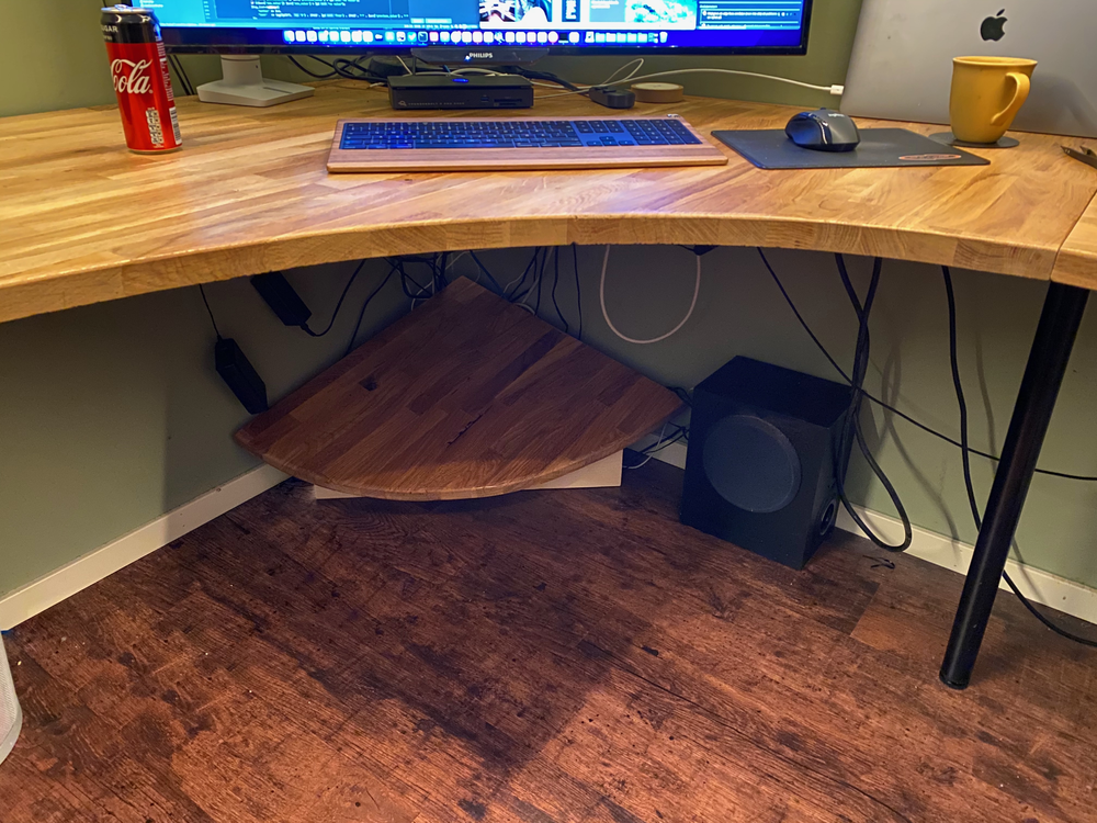 Sedan hade jag min baslåda på golvet och hade fötterna på när jag sitter som vanligt, men det var inte speciellt bekvämt, så bad sonen mäta i höjdled vart min häl och min tår var när dom var liksom som jag ville ha dem, så byggde jag en skiva i en vinkel att ha fötterna på, superbekvämt! Jag gillar ju att sitta bakåtlutad så ett vanligt fotstöd från IKEA hjälpte liksom inte riktigt, men med den här skivan vart det perfekt!