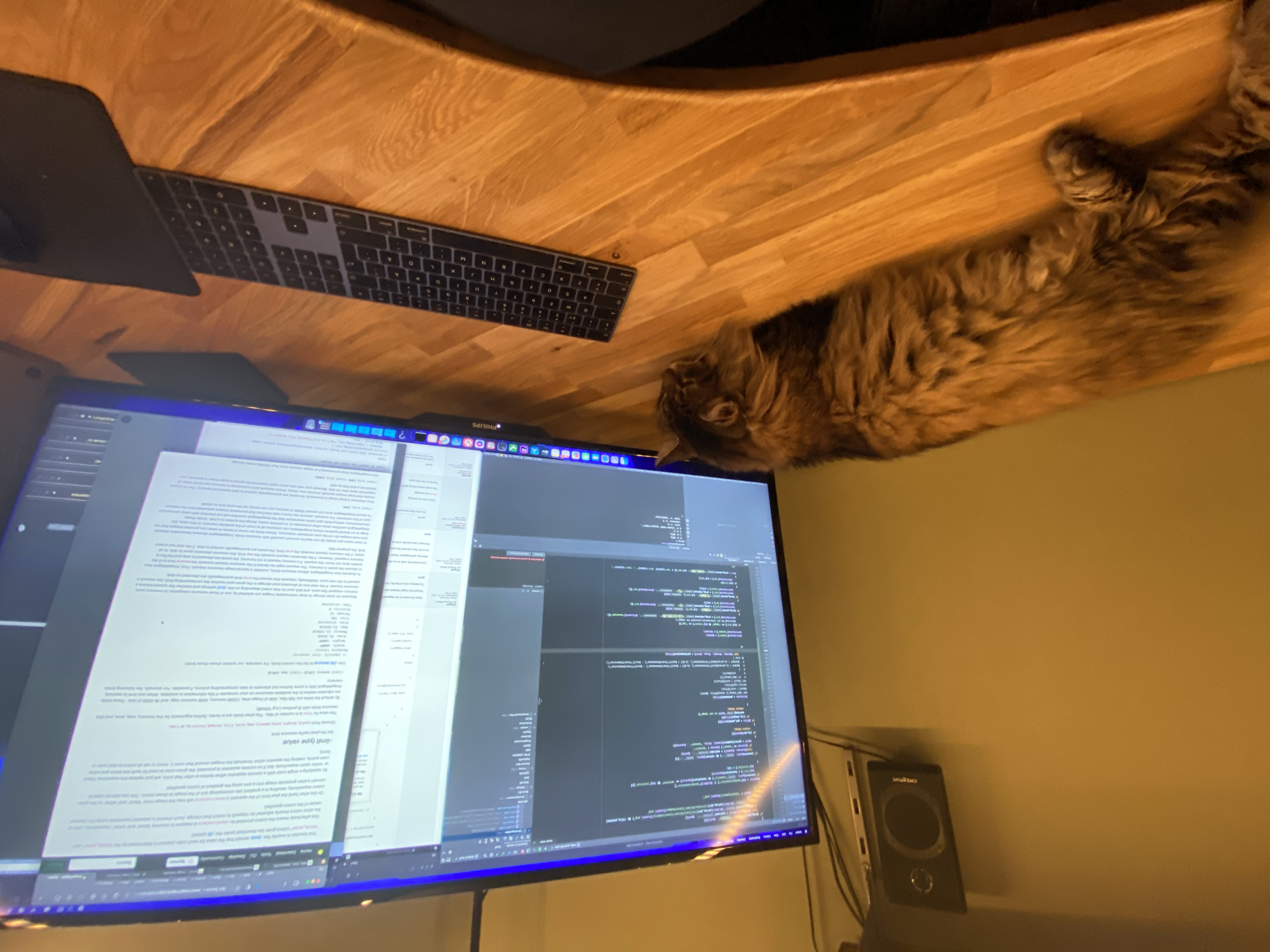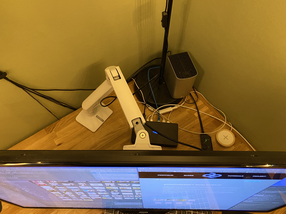 Skaffade nyligen en monitorarm till min skärm i kontoret. Jag sitter ofta med benen på bordet och det blir en rätt vriden artbetsställning, men med monitorarmen så kan jag vrida upp skärmen så den är framför mig trots att jag sitter snett så att säga.