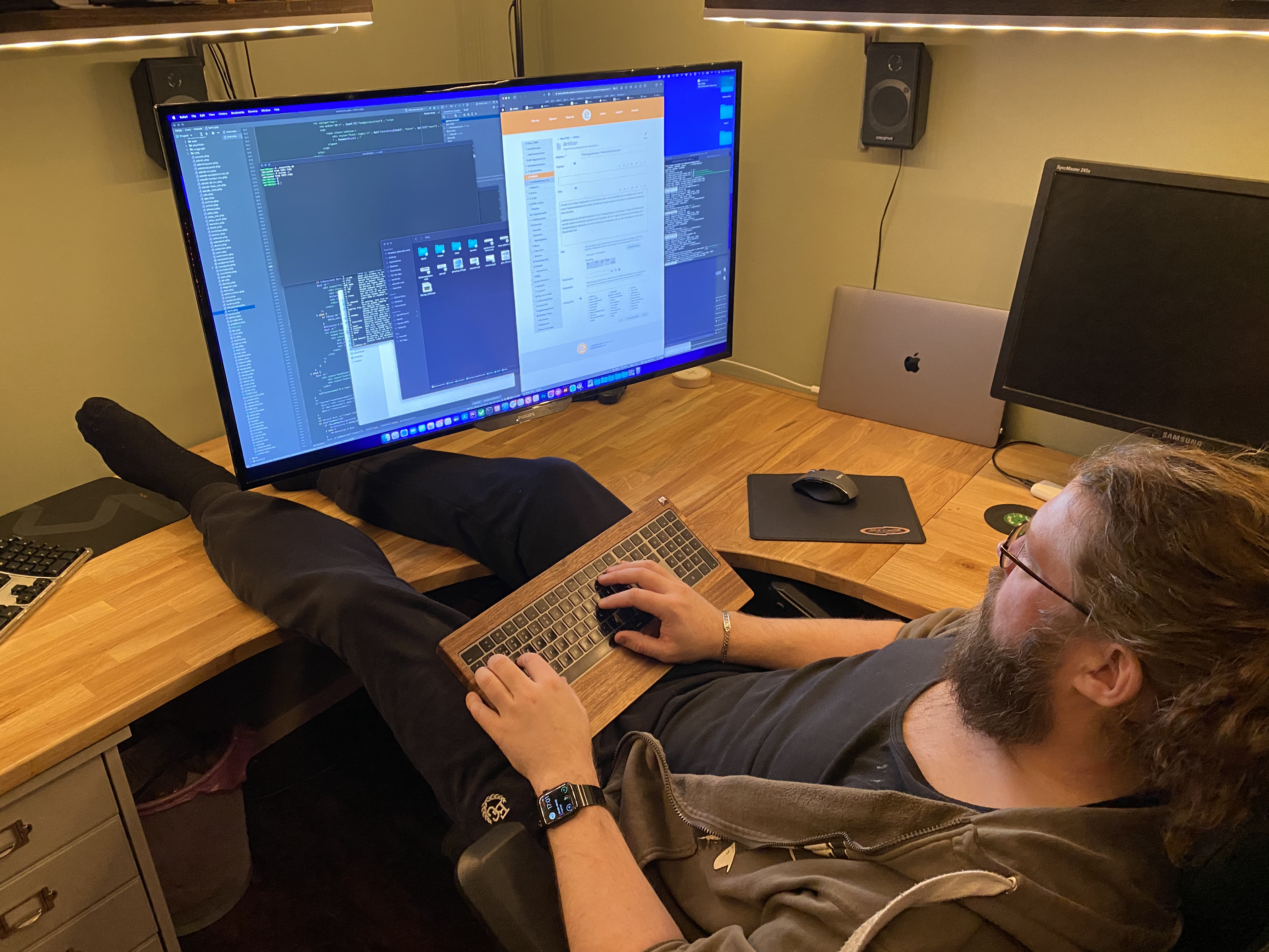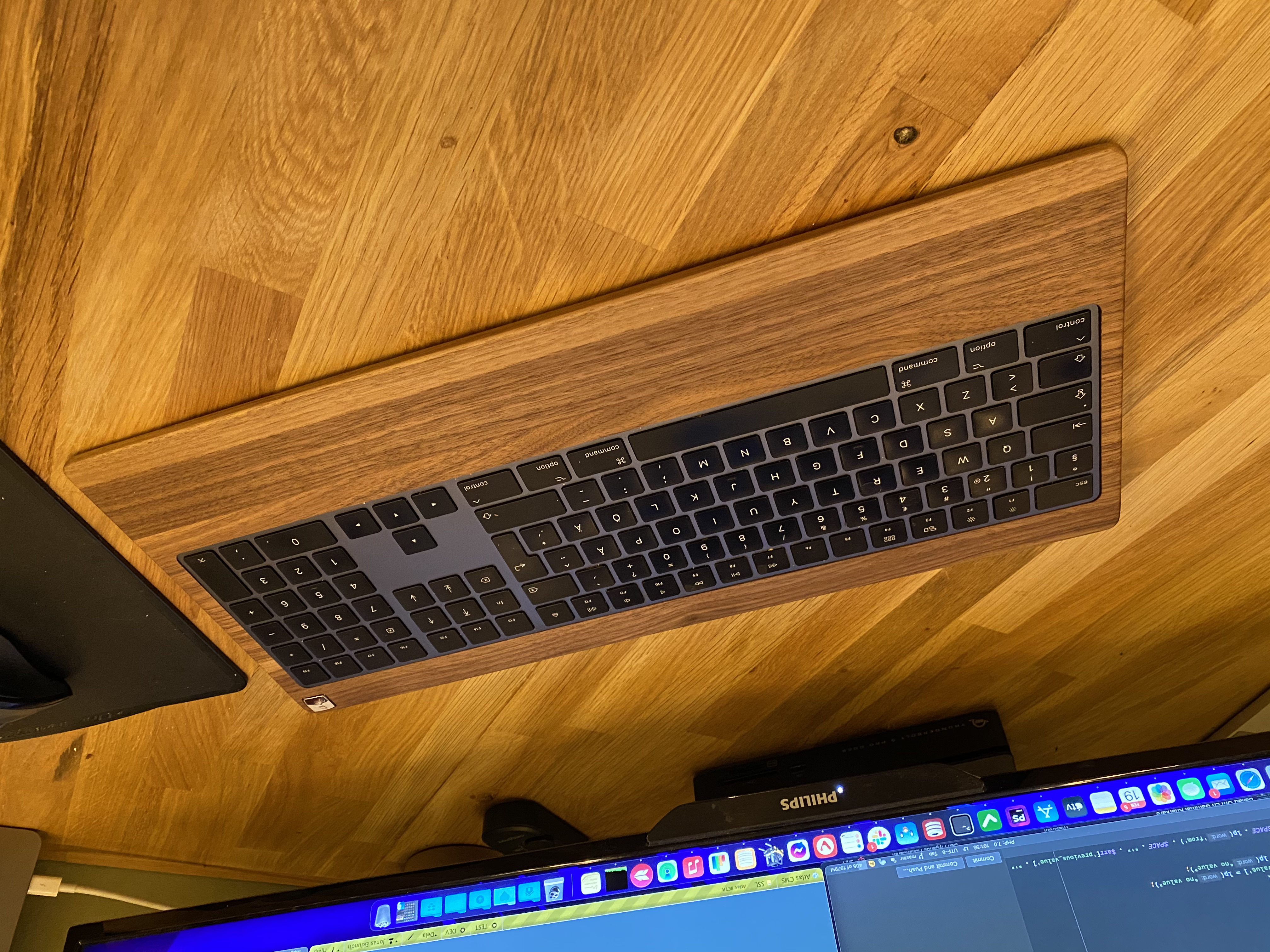 Det var ju fortfarande ett problem med tangentbordet, det är lite svårt att ha i knäet, det blir lite ostadigt. Så jag beställde en skitsnygg "hållare" till det, som gör det enkelt som tusan att ha i knäet medan musen är kvar på bordet. Enda nu är att jag borde ha en kudde på bordet för benen...