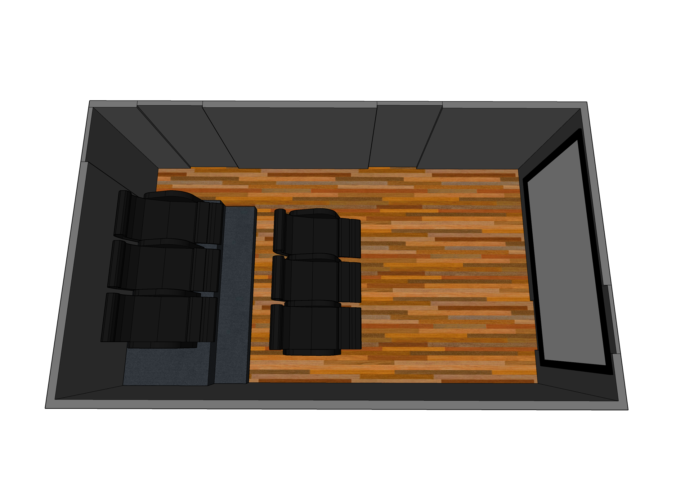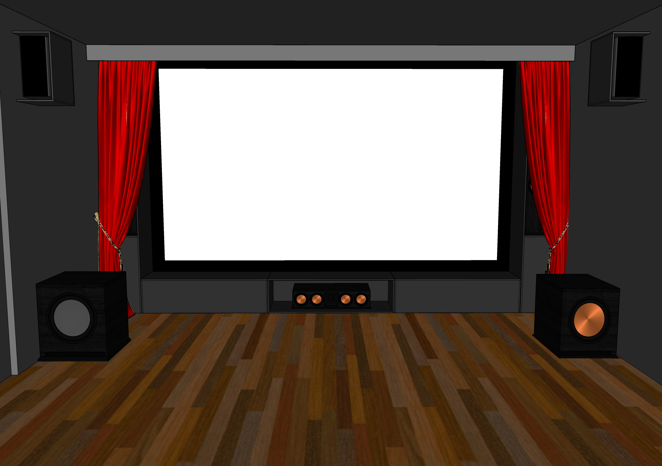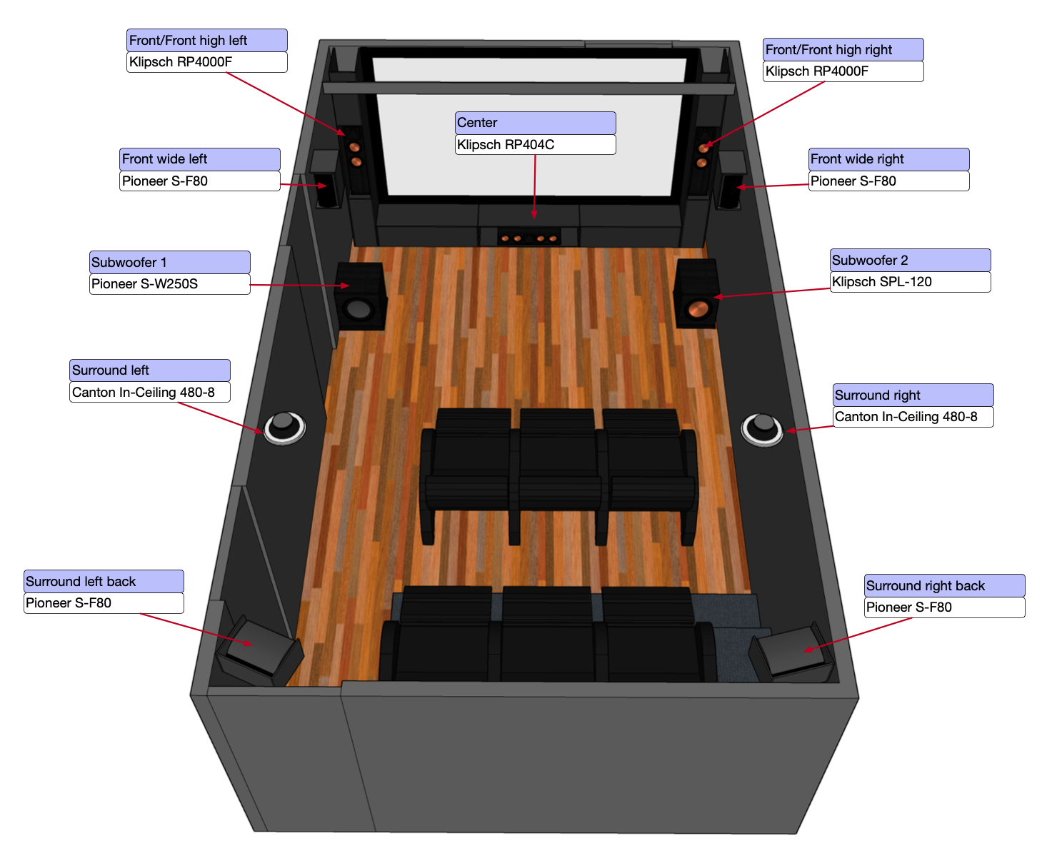Så detta är planen, båda högtalarna på varsin sida om duken är Klipsch RP4000F och kommer bi-ampas så dom funkar som både surround och high surround. Sedan är det en Klipsch RP404C som centerhögtalare. Planen är att behålla min Pioneer S-W250S subwoofer framme till vänster och ställa den nya Klipsch SPL-120 på högersidan. Eventuellt ställer jag en av dem bakom främre stolsraden istället, har inte bestämt mig. Och sen ska jag behålla mina S-F80-högtalare som främre wide surround och bakre surround, och flytta mina in-ceiling högtalare till vänster/höger. Eventuellt takmonterar jag två S-F80 som surround och använder in-ceiling till främre wide surround, har inte bestämt mig än.