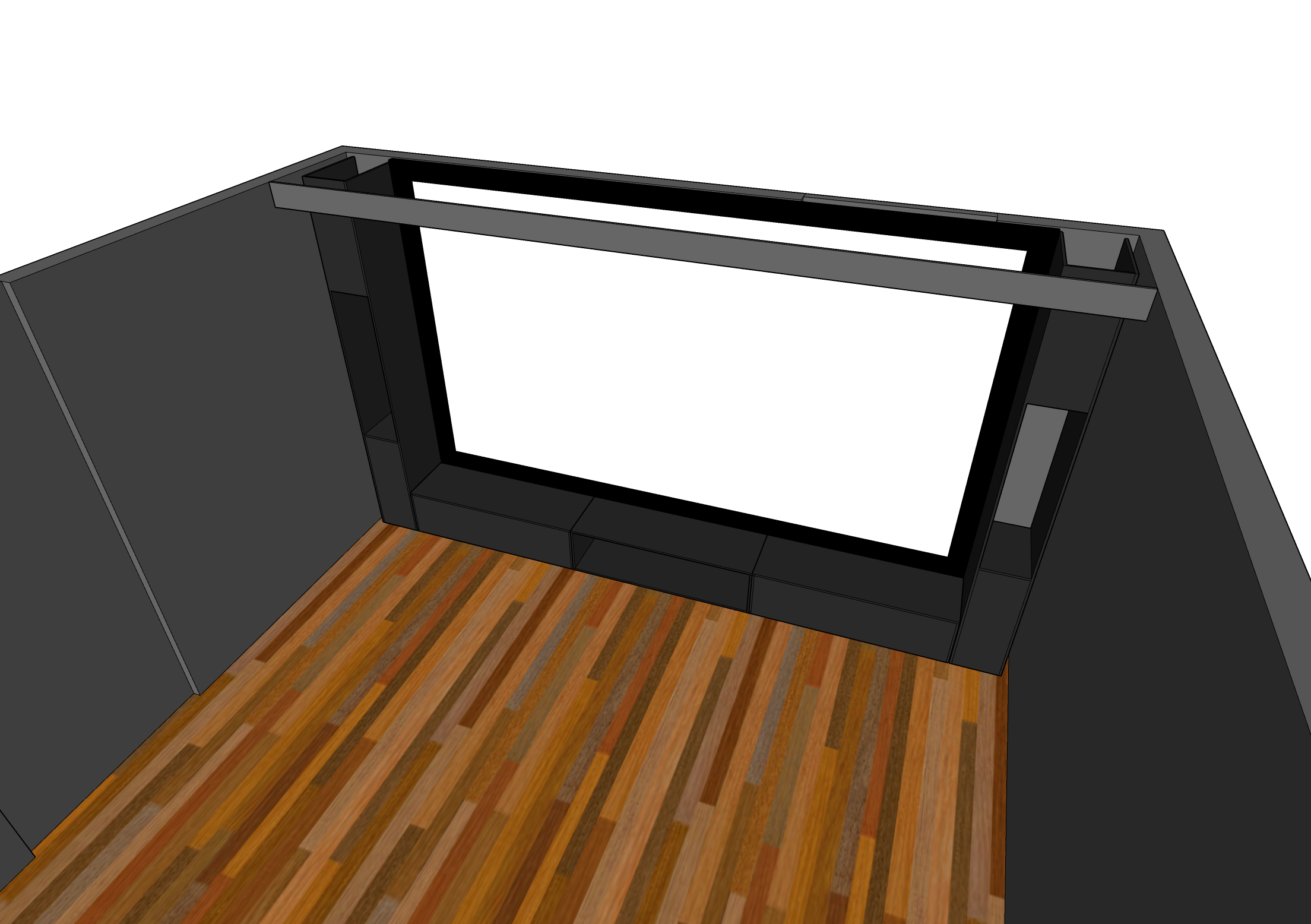 Runt bioduken har jag byggt en ställning för främre surround och centern, och alla dom högtalarna ska ersättas så utrymmet som idag är byggda för mina Pioneer-högtalar vid sidan av duken måste byggas om lite för att rymma dom nya mycket större högtalarna.