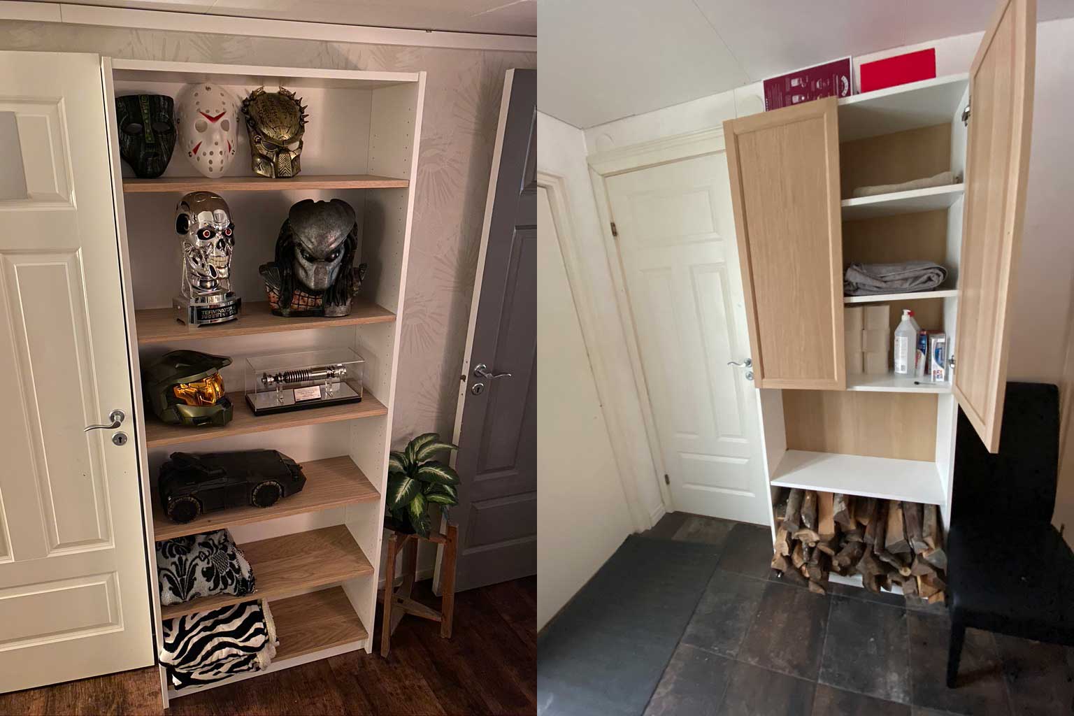 Så jag köpte tre billybokhyllor, två vita och en i ekfanér. Sedan på övervåningen där det behövdes förvaring för toapapper, tvål och handdukar så blev det en vit med vita hyllor och ekbaksida, samt två ekdörrar.