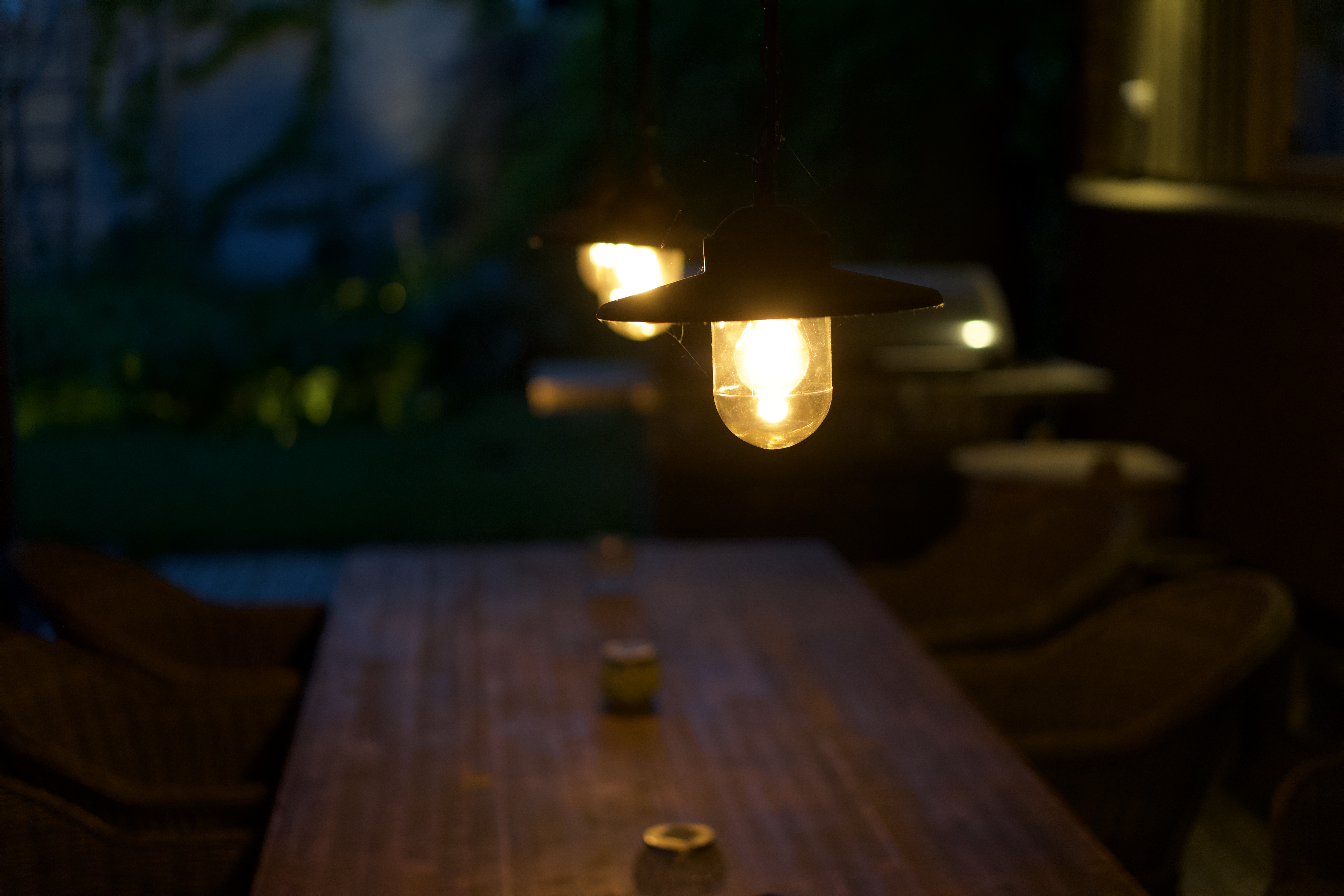 Hittade fina taklampor menade för uteplats på bauhaus faktiskt, så köpte tre sådana. Sen Philips Hue filament-lampor i dem för det där mysiga varma ljuset.