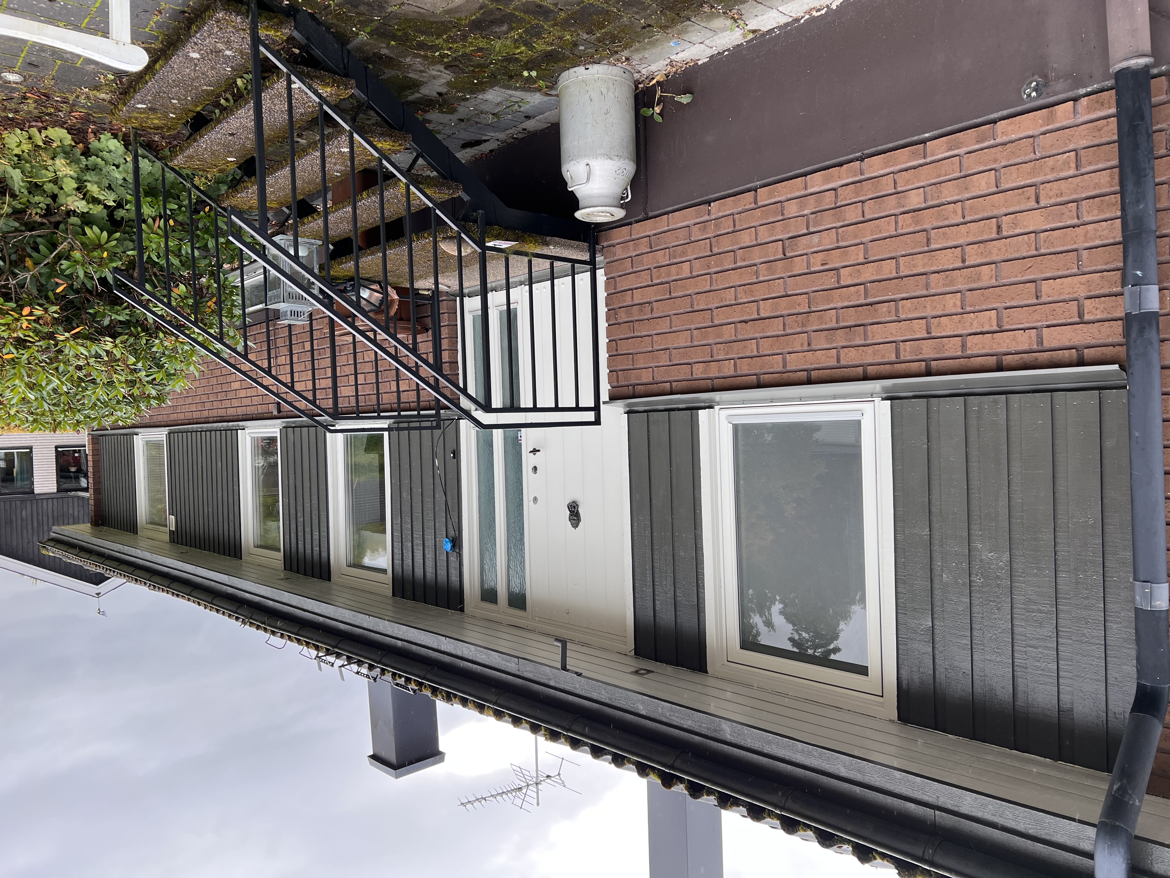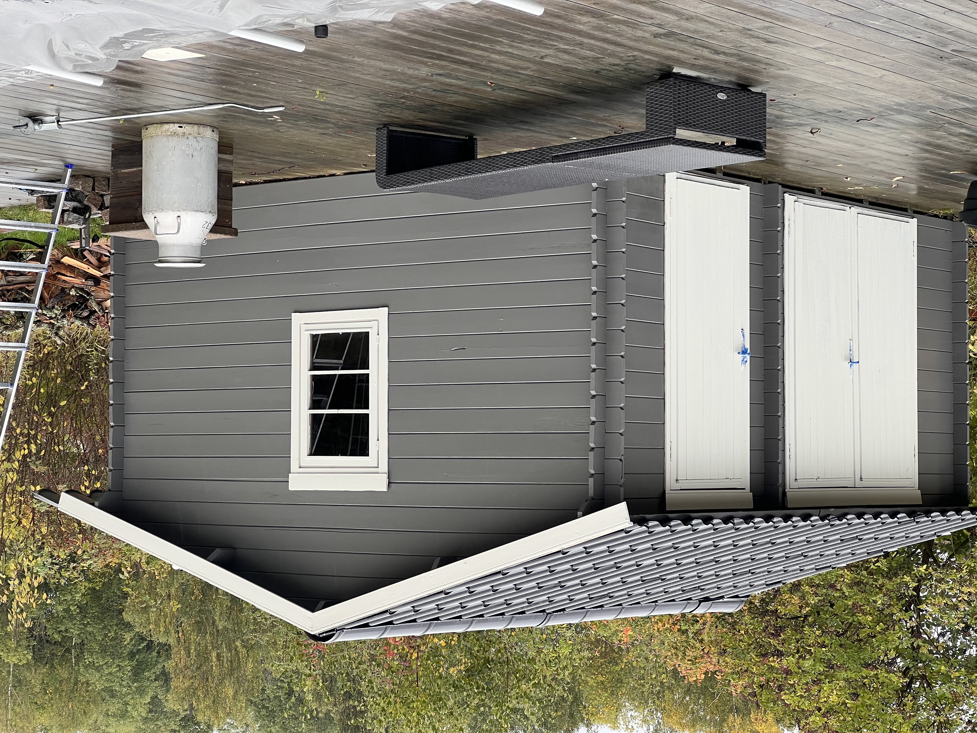 Till brunt tegel är det inte många färger som passar. Faktum är att inga färger passar, så det fick lov att bli mörkgrått och off-white. Och jäklar vad snyggt det blev! Till och med boden fick ny färg!