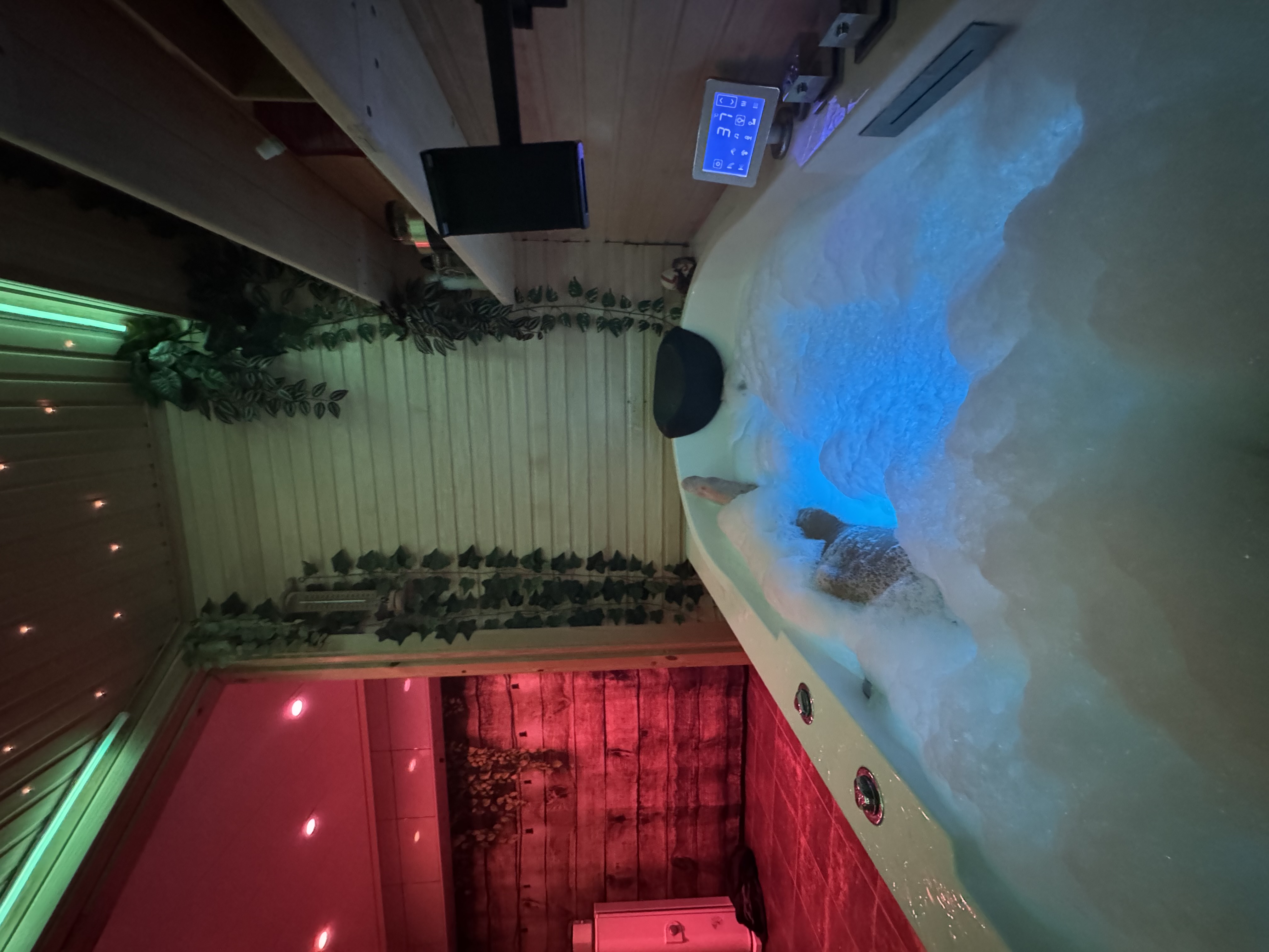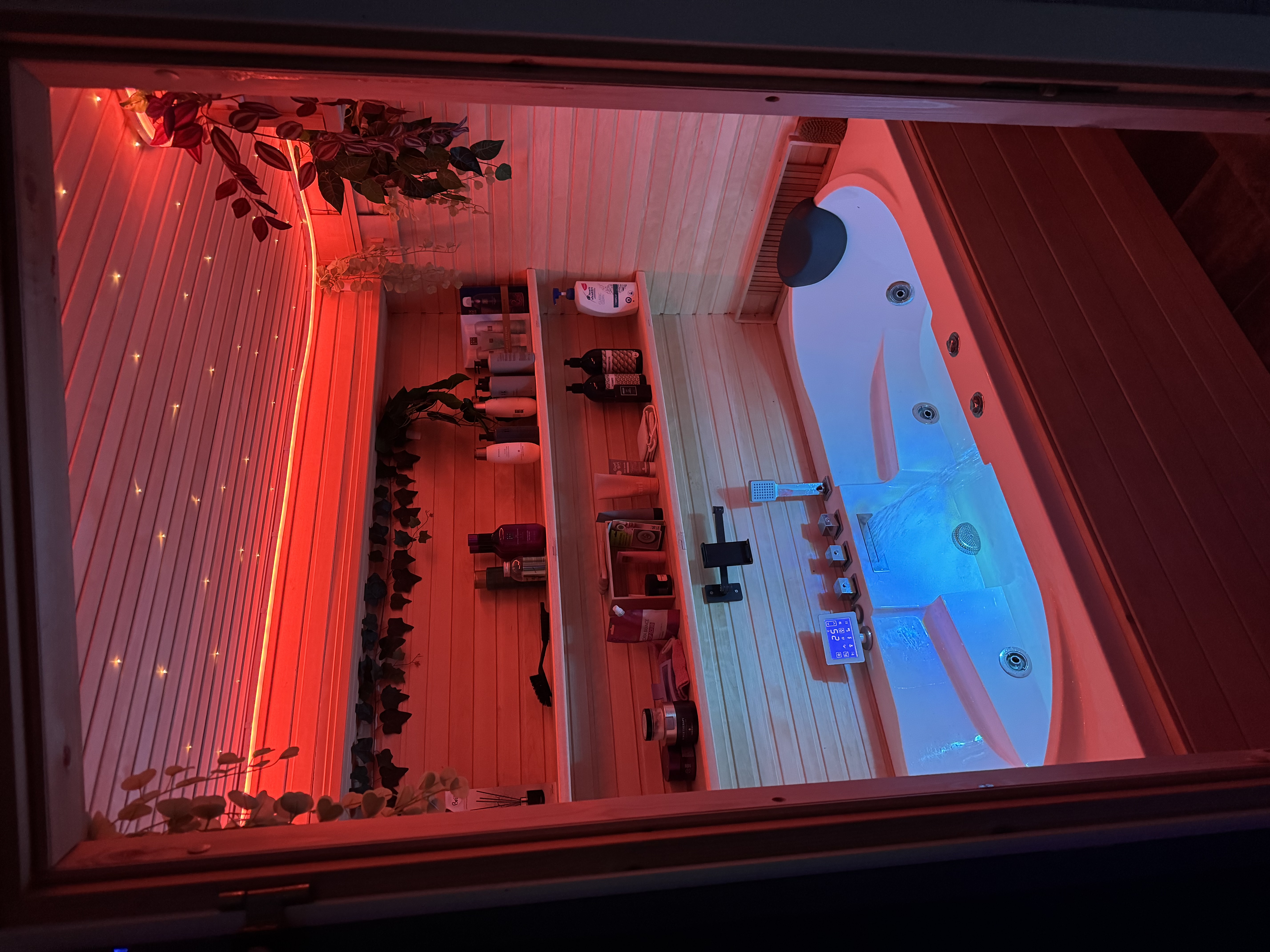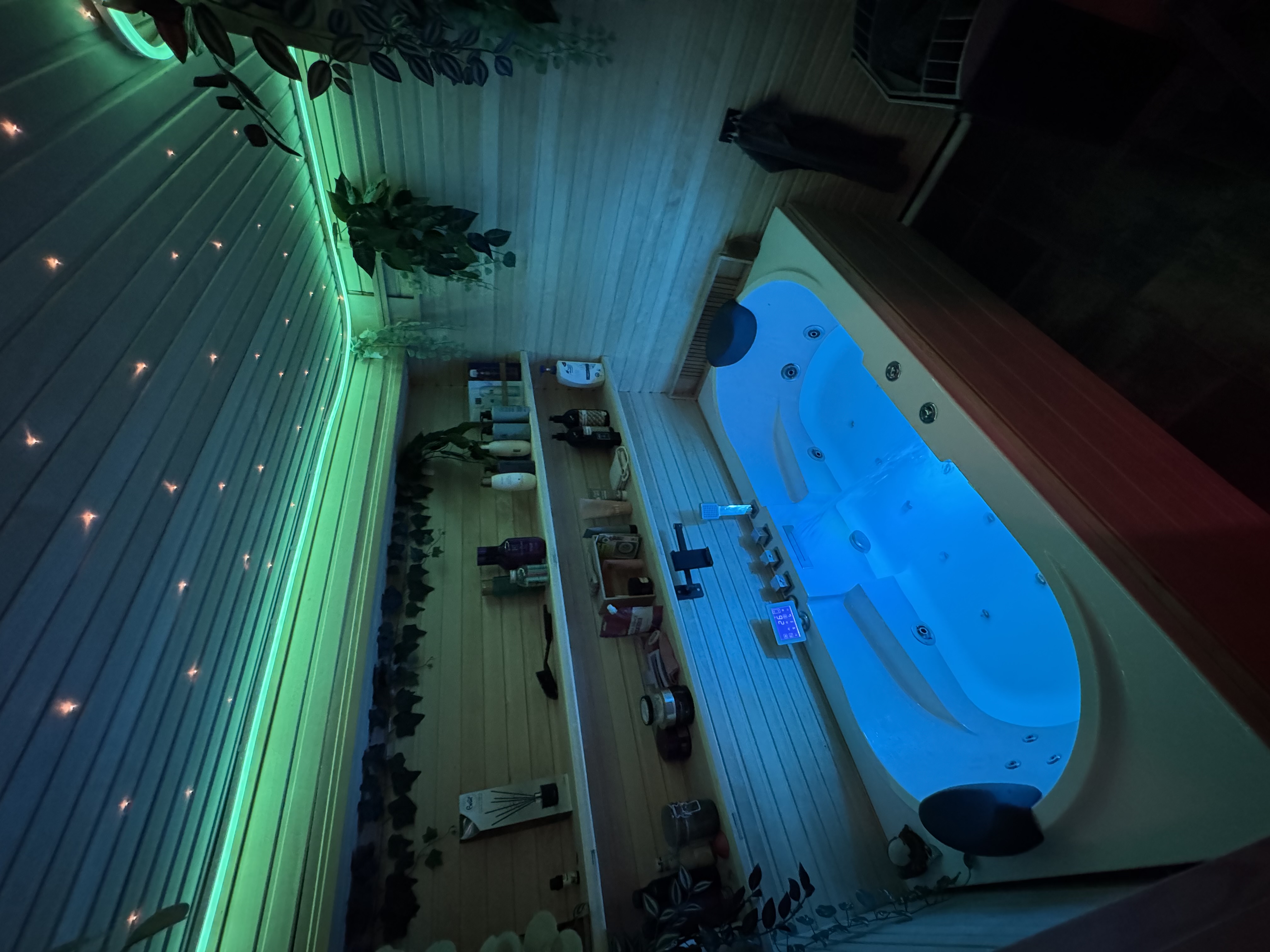 Så en led-list i taket som kompletterar stjärnhimlen, lite grönt som inreder rumemt lite mysigt, en hållare för telefon eller iPad på väggen. Sen är det ett stort duschdraperi som döljer tvättstugan när man vill mysa till det lite extra.