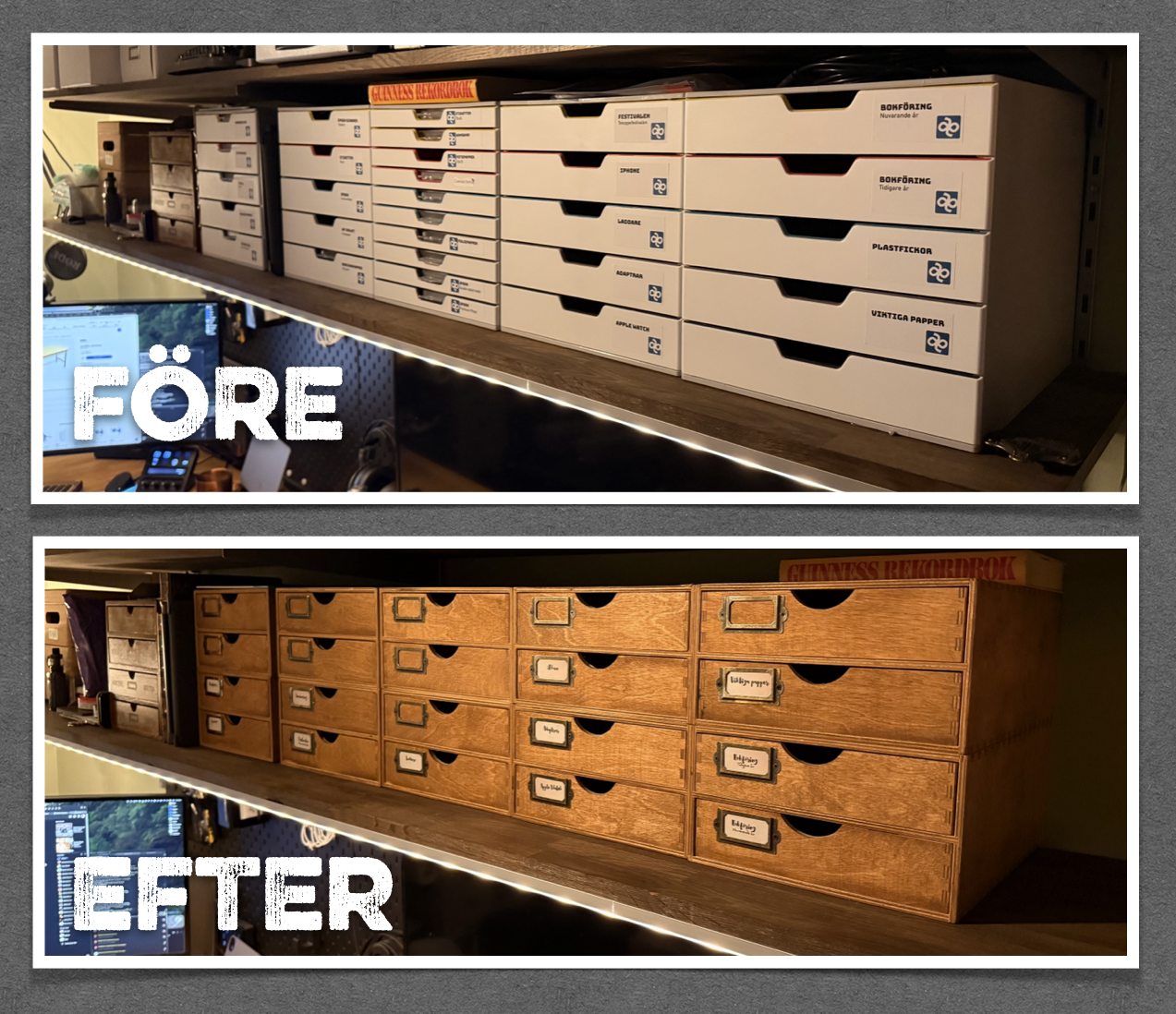 Hade en uppsjö med fula plastlådor för papper och sånt i kontoret, så jag kände att jag behövda fixa något som såg lite mer hemtrevligt ut, så det blev nya trälådor