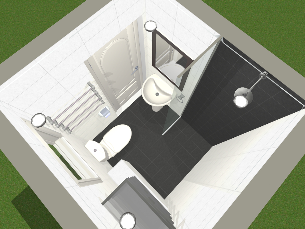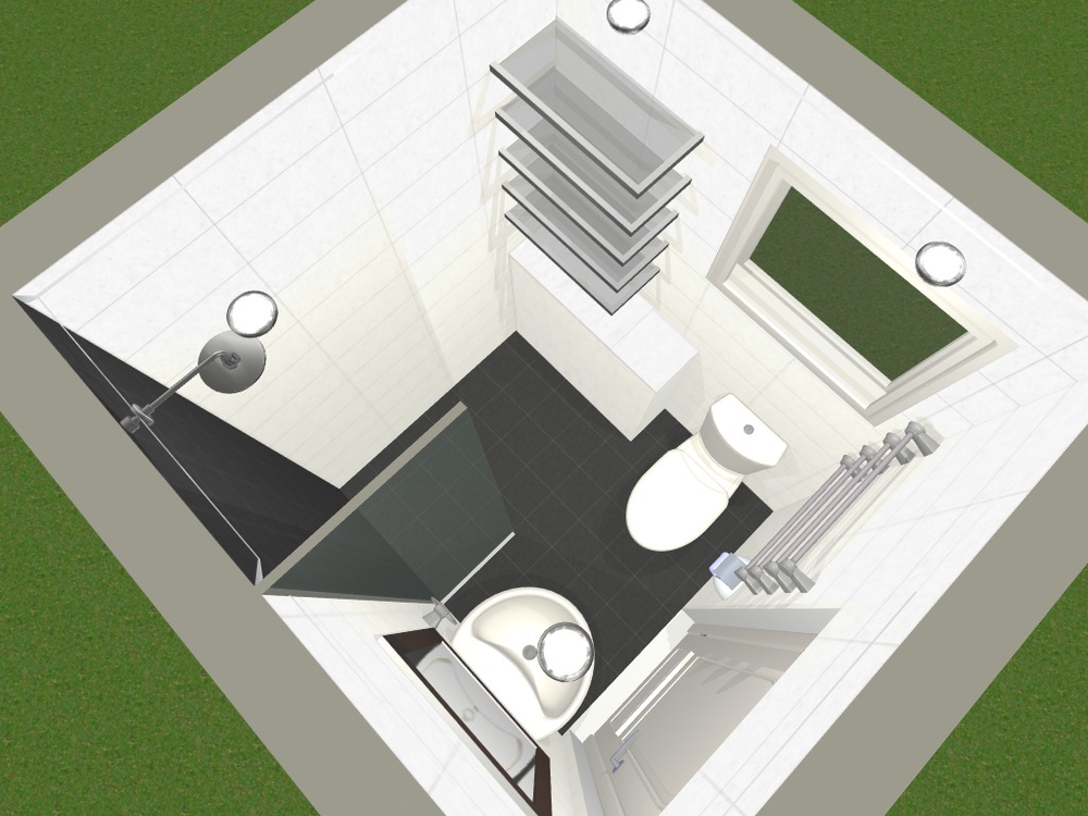 Här ser man duschen och handfatet, mellan dem hade vi tänkt oss en glasskiva för att undvika stänk över golvet mot dörren. Men det får inte vara för stor, allt måste få plats. Handfatet här är normalstort men det finns en chans att vi tar ett lite mindre.