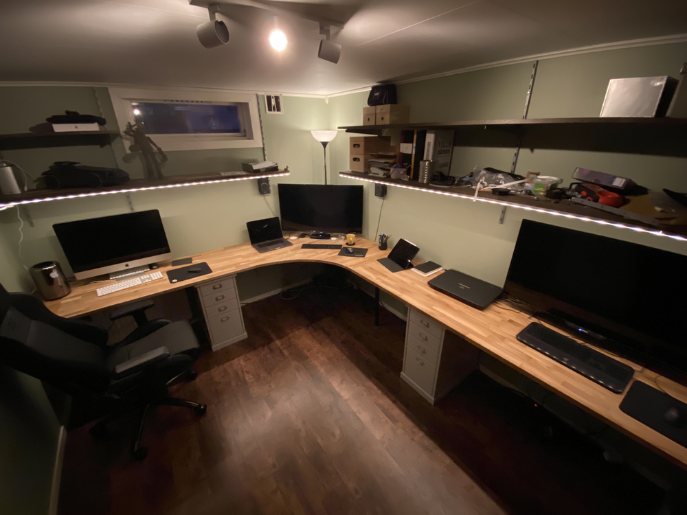 Det var svårt att hitta skrivbord som var rätt dimensioner och rätt pris, så jag köpte köksbänksskivor på Bauhaus och sågade dem till rätt dimensioner och satte ihop dem. Och här är resultatet: