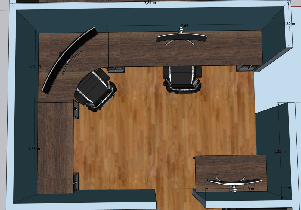 Sen en ritning på hur kontoret ska se ut och fungera. Tanken är att man ska kunna sitta fyra personer där, inte för att jobba, utan mer för att spela. Som mest blir vi nog två som sitter här och jobbar.