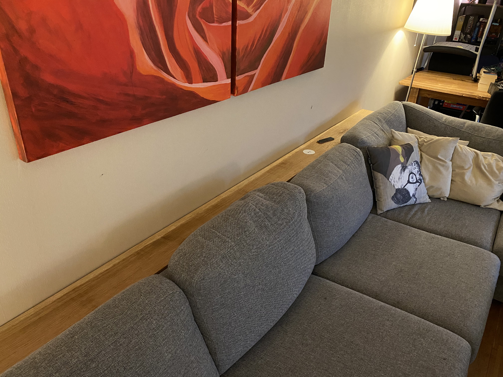 Detta är en grej jag velat ha länge, en hylla bakom soffan där man kan ställa kaffekoppen när man ser på TV. Sågade till en grov ekskiva och satte på sidodelar så den står på golvet och sedan hålls den på plats av soffan.