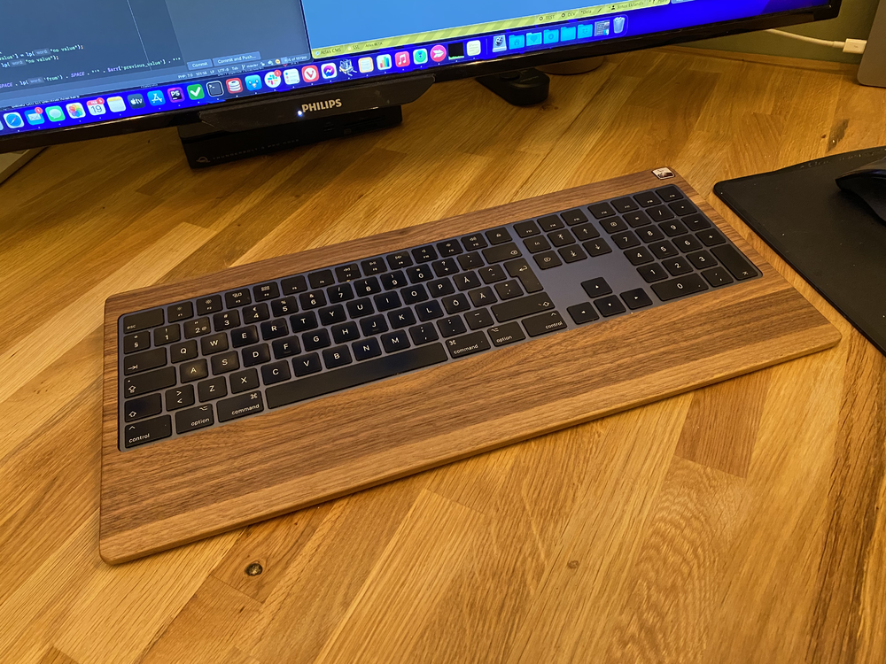 Det var ju fortfarande ett problem med tangentbordet, det är lite svårt att ha i knäet, det blir lite ostadigt. Så jag beställde en skitsnygg "hållare" till det, som gör det enkelt som tusan att ha i knäet medan musen är kvar på bordet. Enda nu är att jag borde ha en kudde på bordet för benen...
