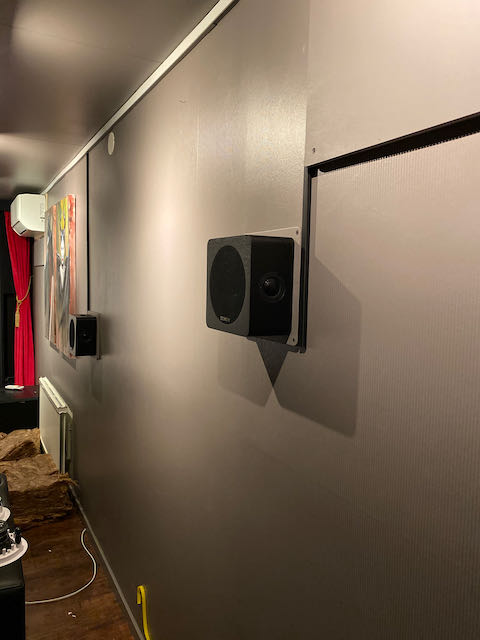 Sen upp på väggarna. Helt klart pilligt att få upp själv men det gick bra till slut. En av högtalarna hamnade på skivan som sitter för fönstret i rummet.