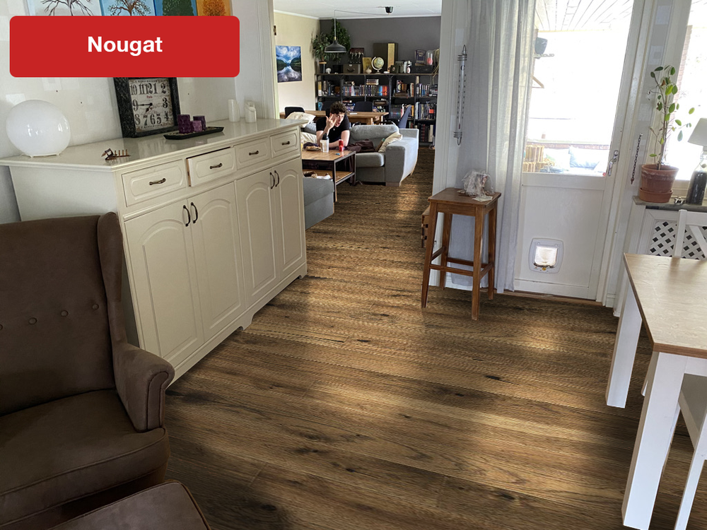 Har beställt golvprov från Byggmax för att se vilket golv som kan passa, men kunde inte vänta, så har photoshoppat ihop ett par bilder med lite olika golv, favoriten är nog "Nougat"
