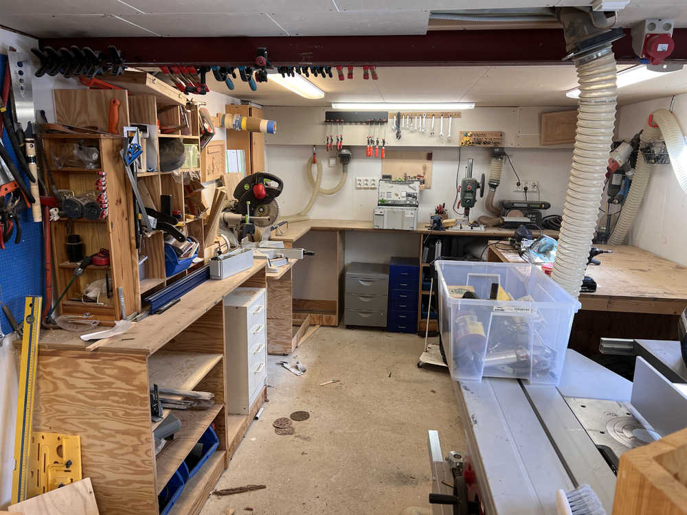 Så här ser verkstaden ut innan, inte en jättebra bild men sågen står i mitten av det här rätt så trånga utrymmet, och det är en rätt stor såg. Sen är en tanke att skaffa lite bättre inredning med skåp och lådor.